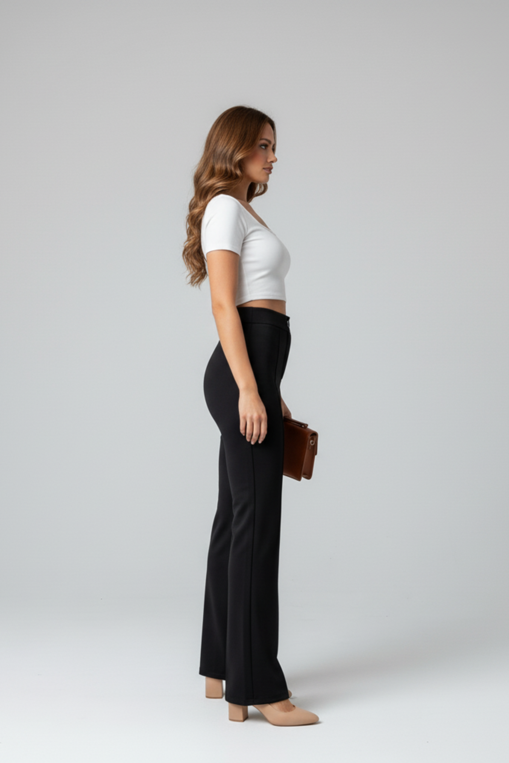Yüksek bel tasarımı, bel bölgesini destekleyerek gün boyu rahatlık sağlar. Ön kısımda yer alan çıma detayı, pantolona hem daha düzgün bir form hem de sofistike bir görünüm kazandırır. İspanyol paça kesimi ve palazzo kalıbı, kadın bacak boyunu optik olarak uzatarak zarif bir duruş sunar.