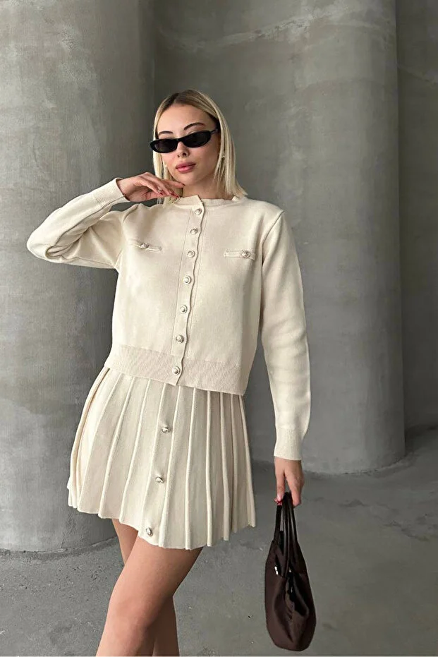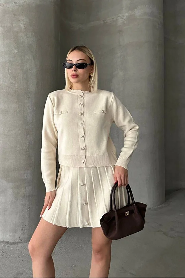 Zamansız şıklığın en sade hâliyle buluştuğu kadın triko mini etek hırka takım – krem, modern ve zarif stilin vazgeçilmez parçası olmaya aday.
