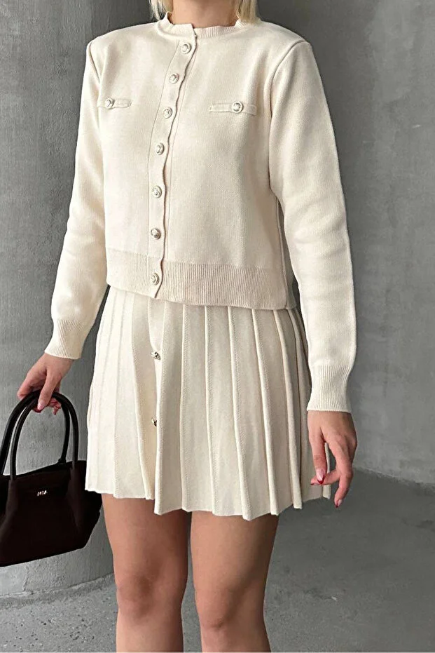 Kadın Triko Mini Etek Hırka Takım – Krem