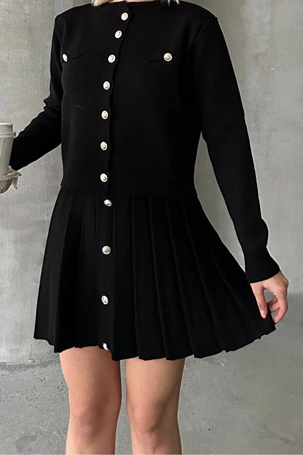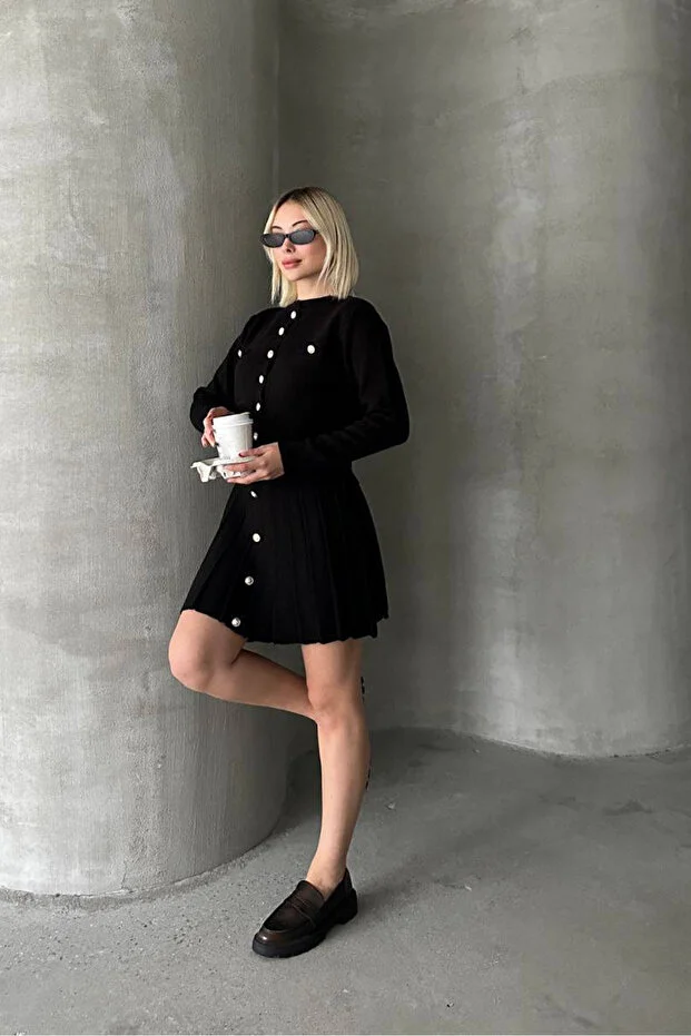 Düğme detaylı hırka modeli klasik bir şıklık yaratırken, mini triko etek formu feminen bir görünüm kazandırır.