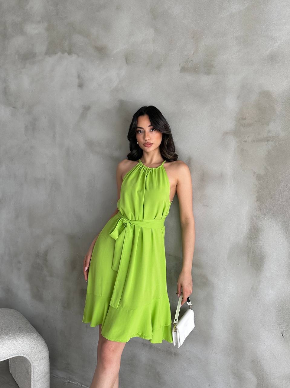 Kadın Yeşil Boyundan Ayarlamalı Kuşaklı Kloş Elbise