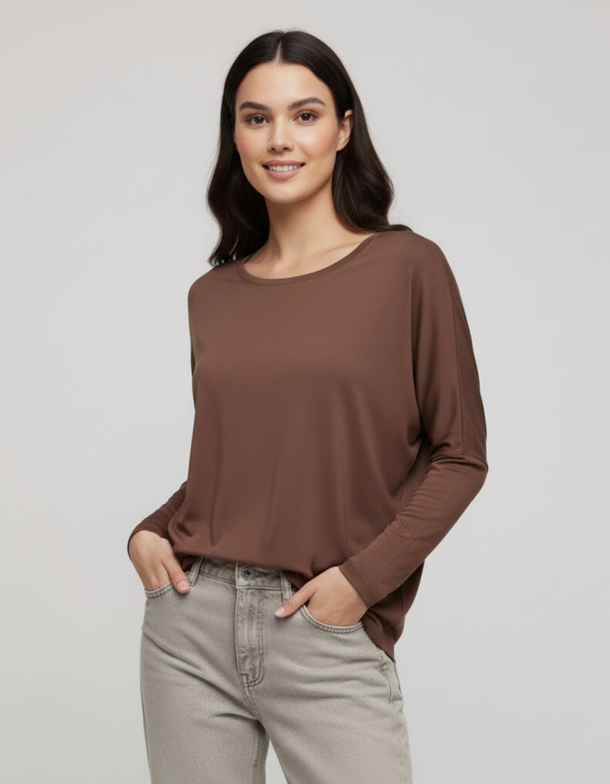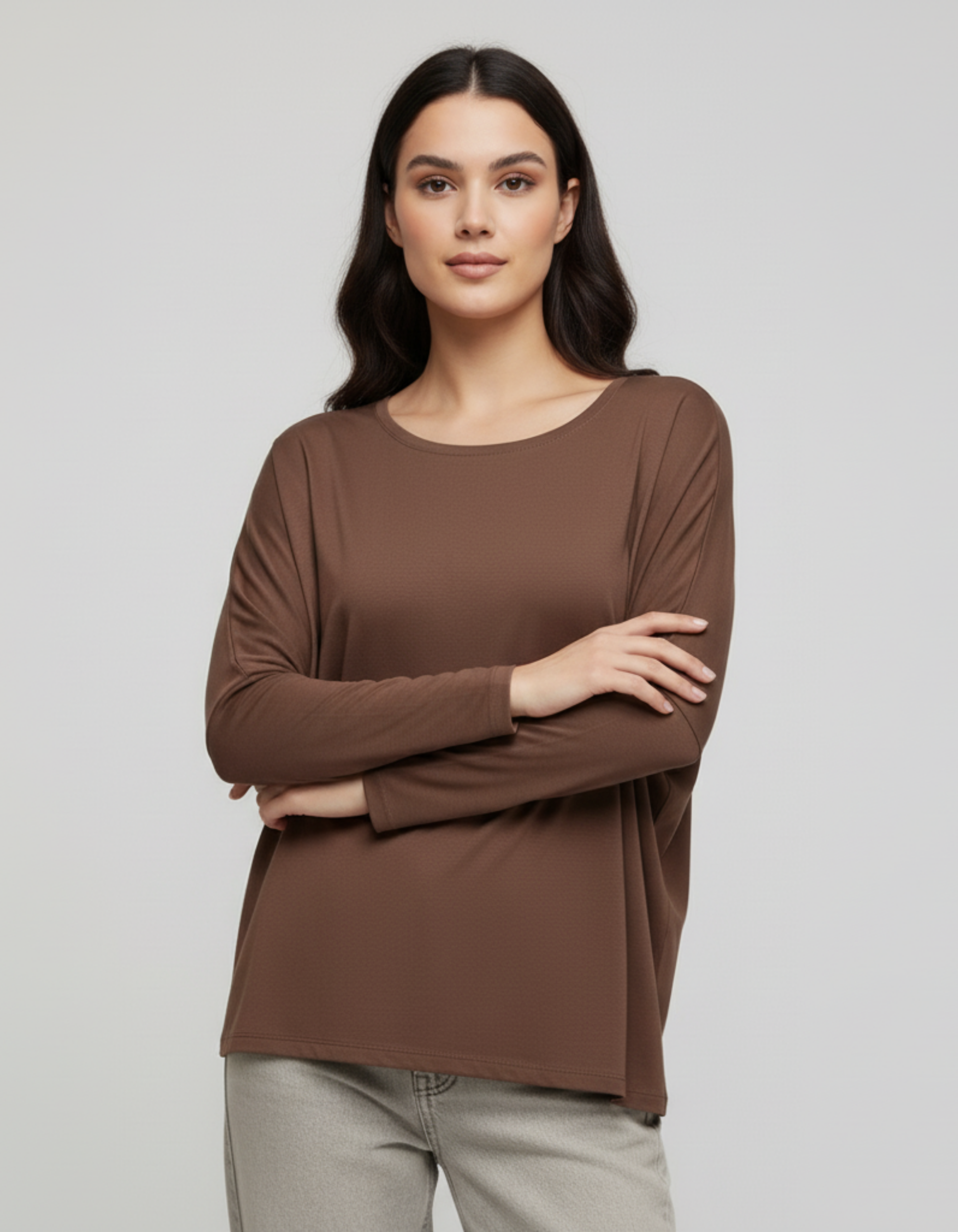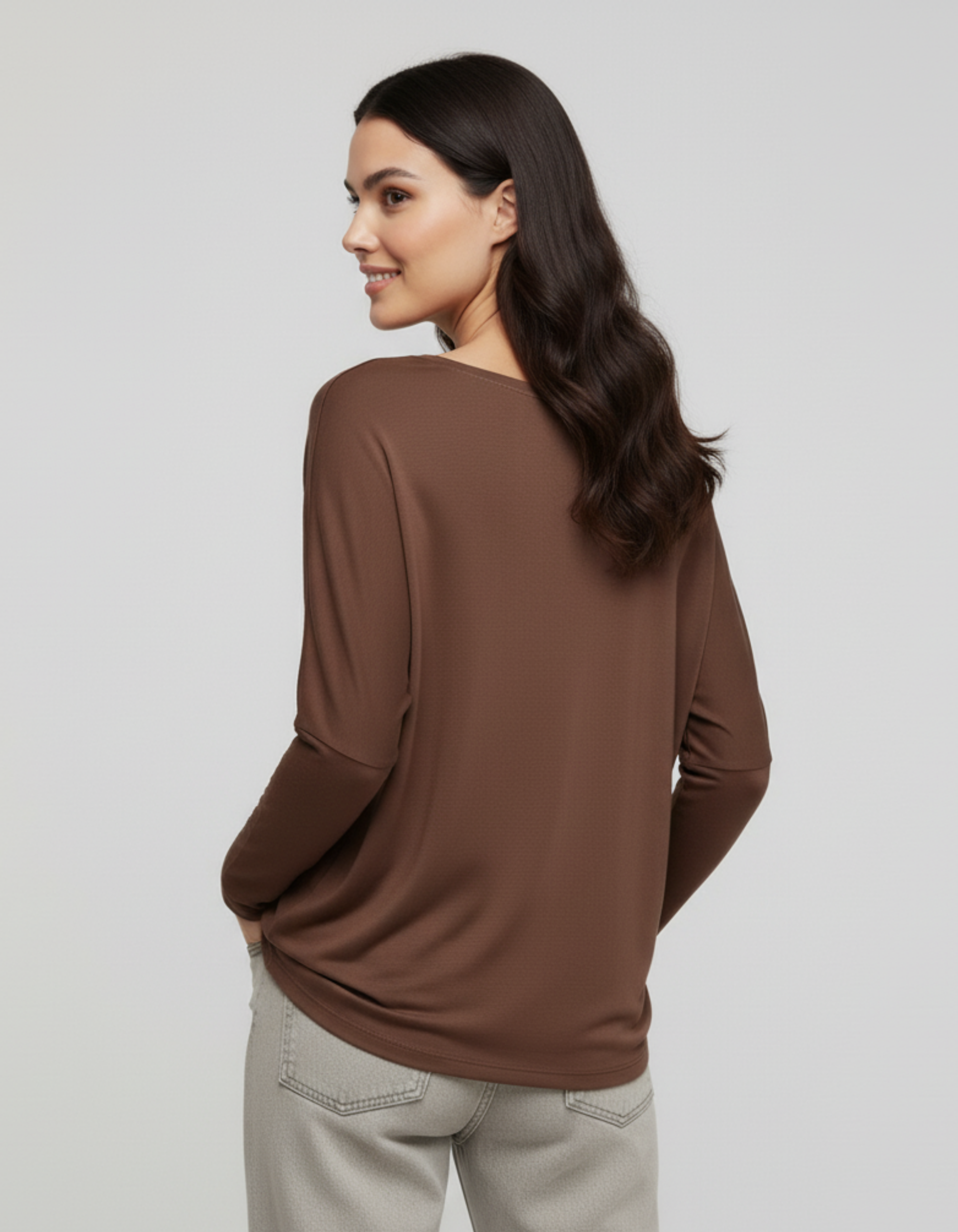 Kahverengi Basic Uzun Kollu Viskon Kadın Bluz
