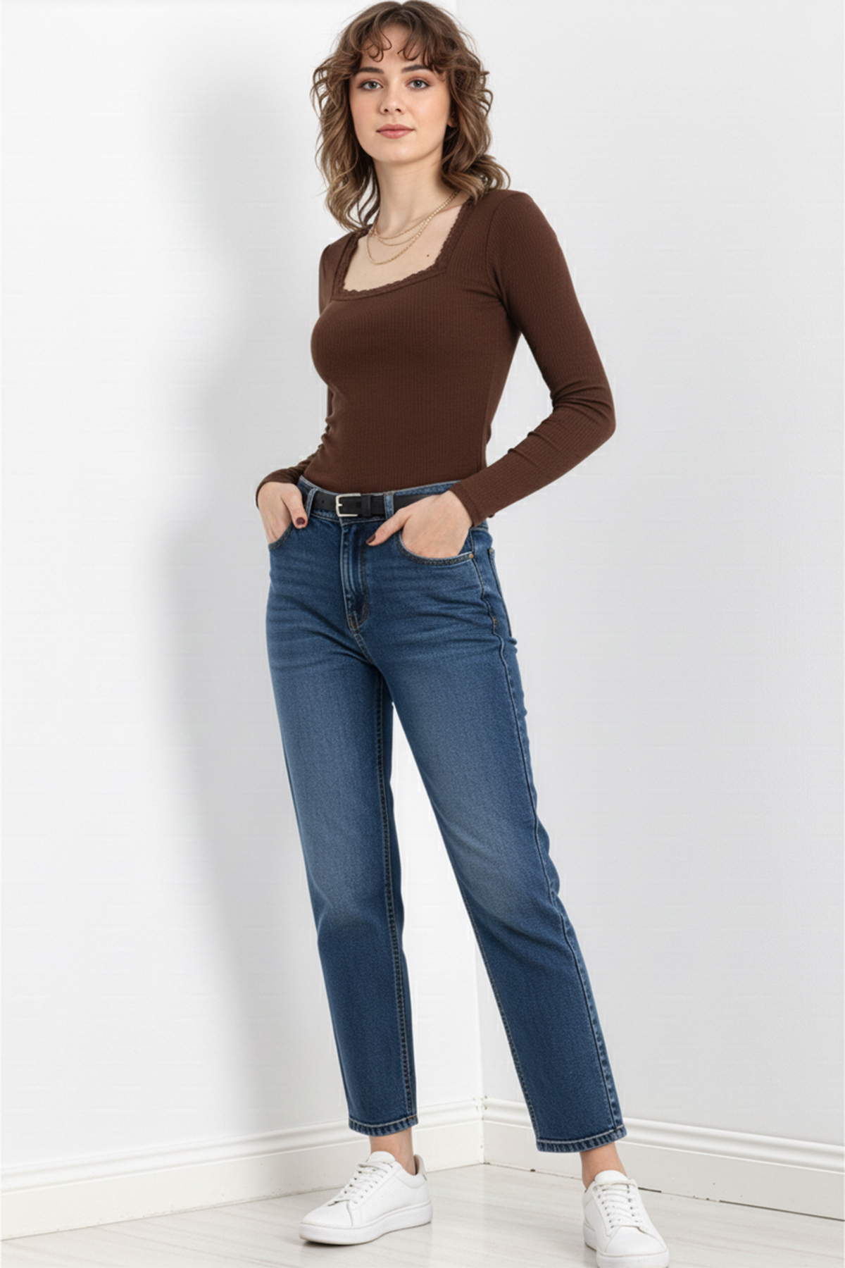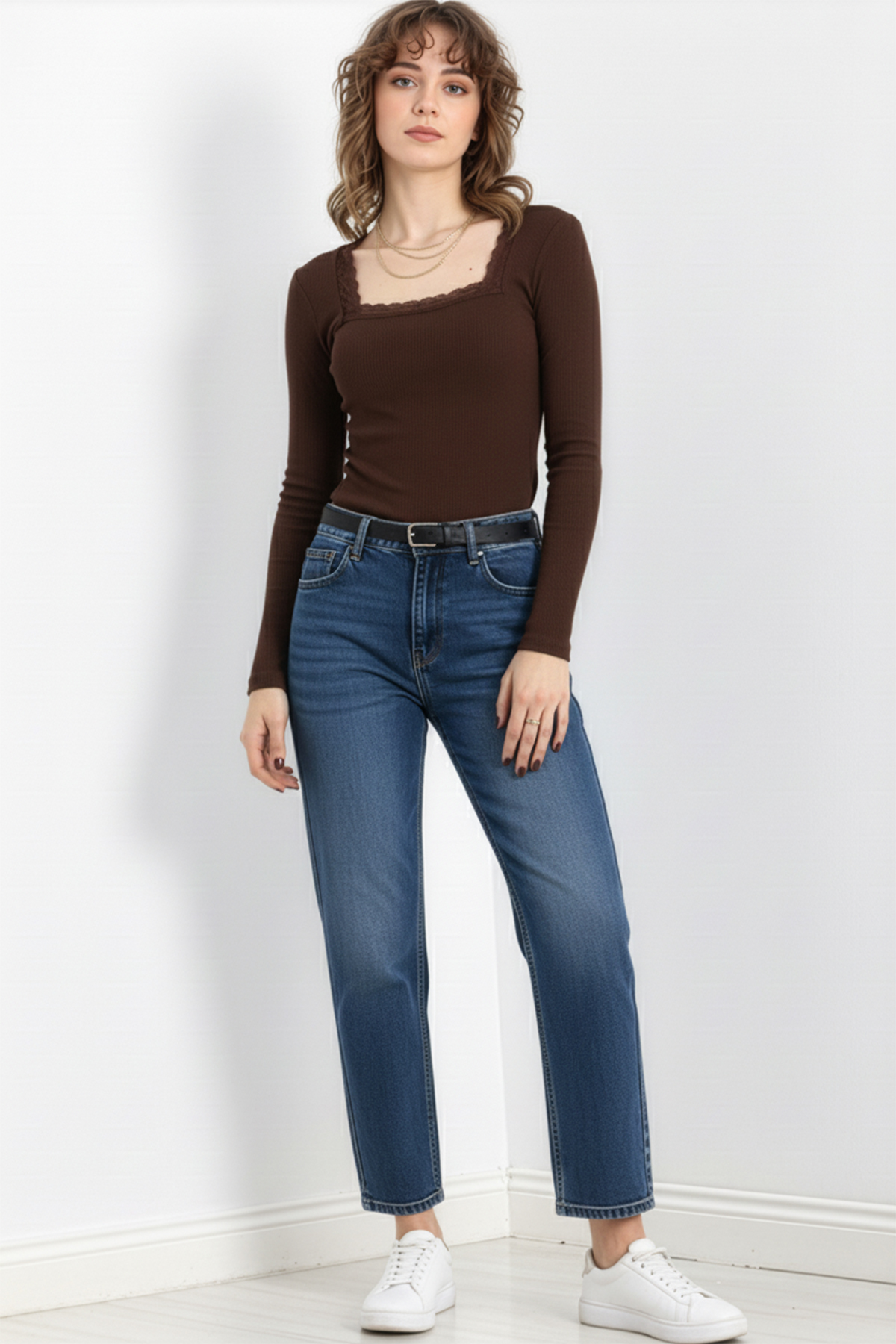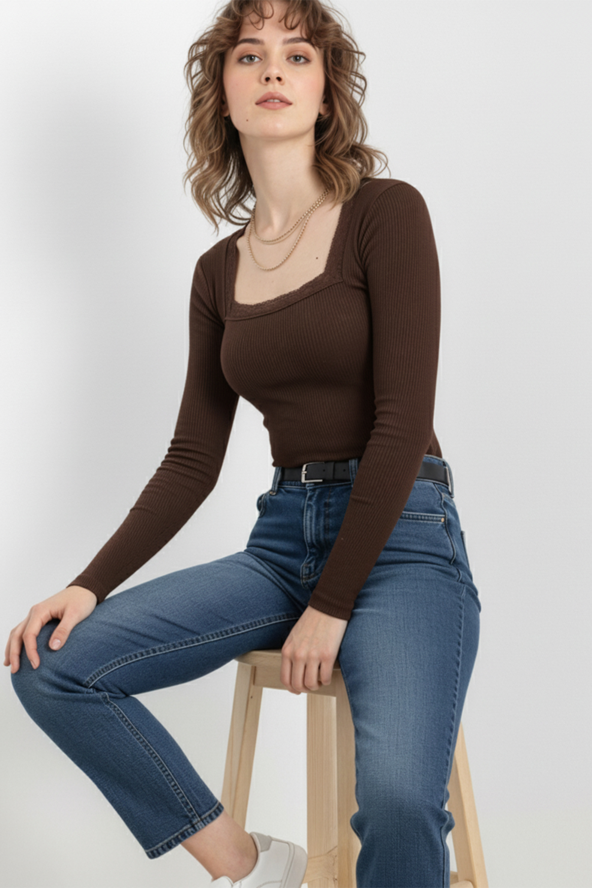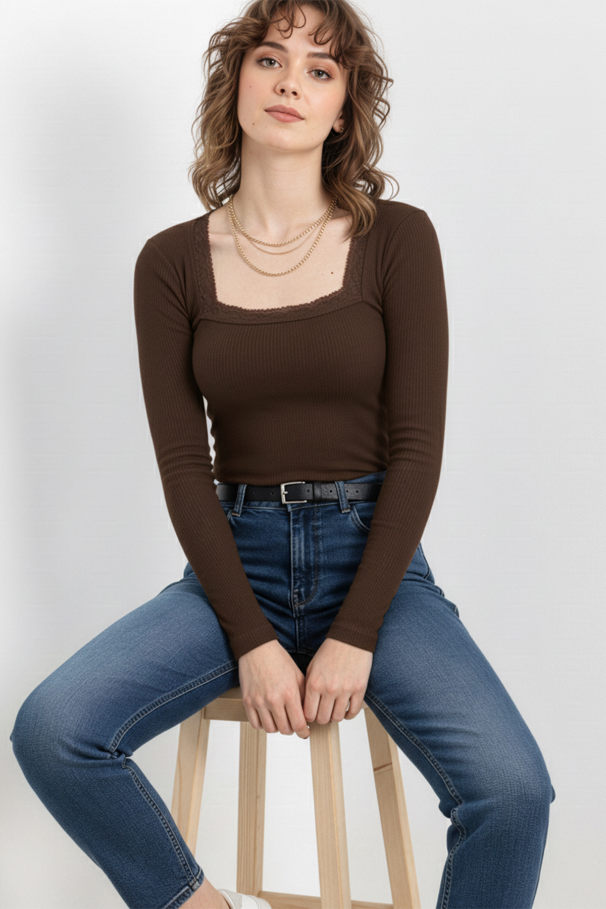 Kare Yaka Dantelli Kaşkorse Bluz – Kahverengi