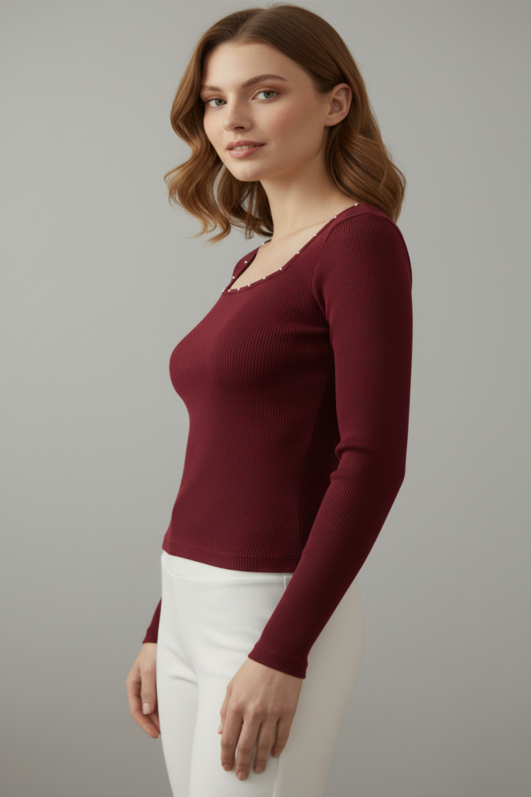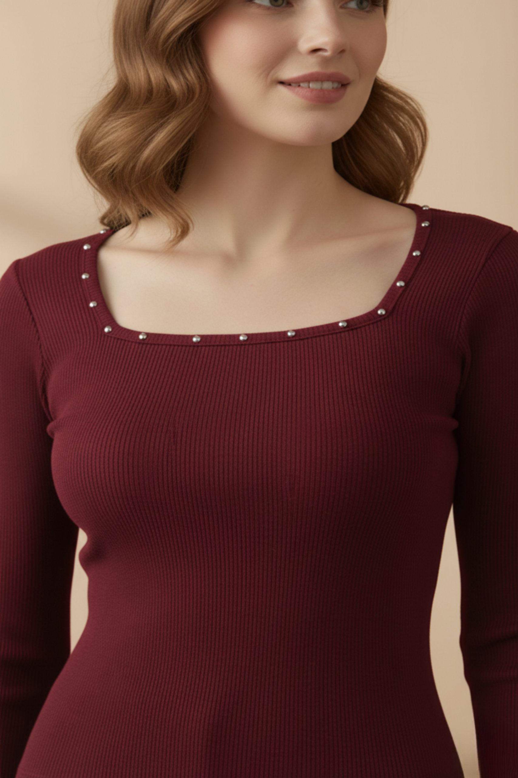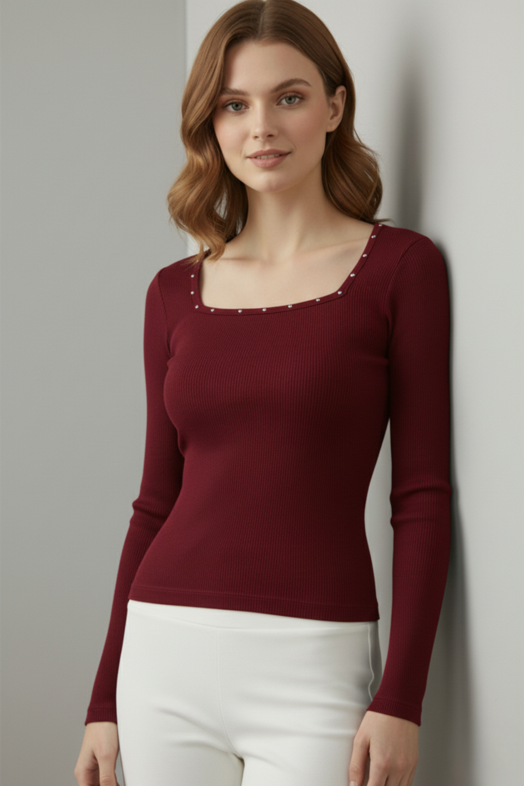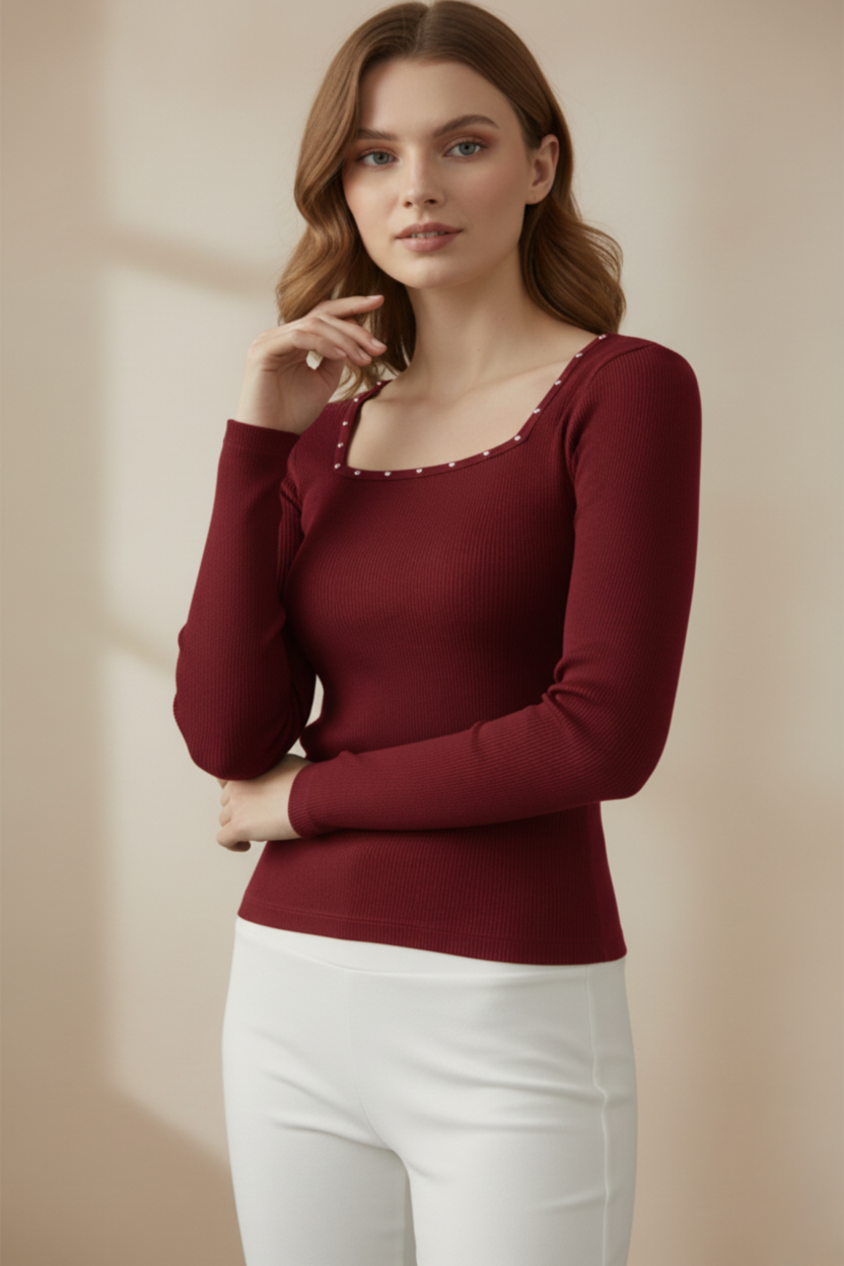 Kare Yaka İnci Çakmalı Fitilli Kaşkorse Bluz – Bordo