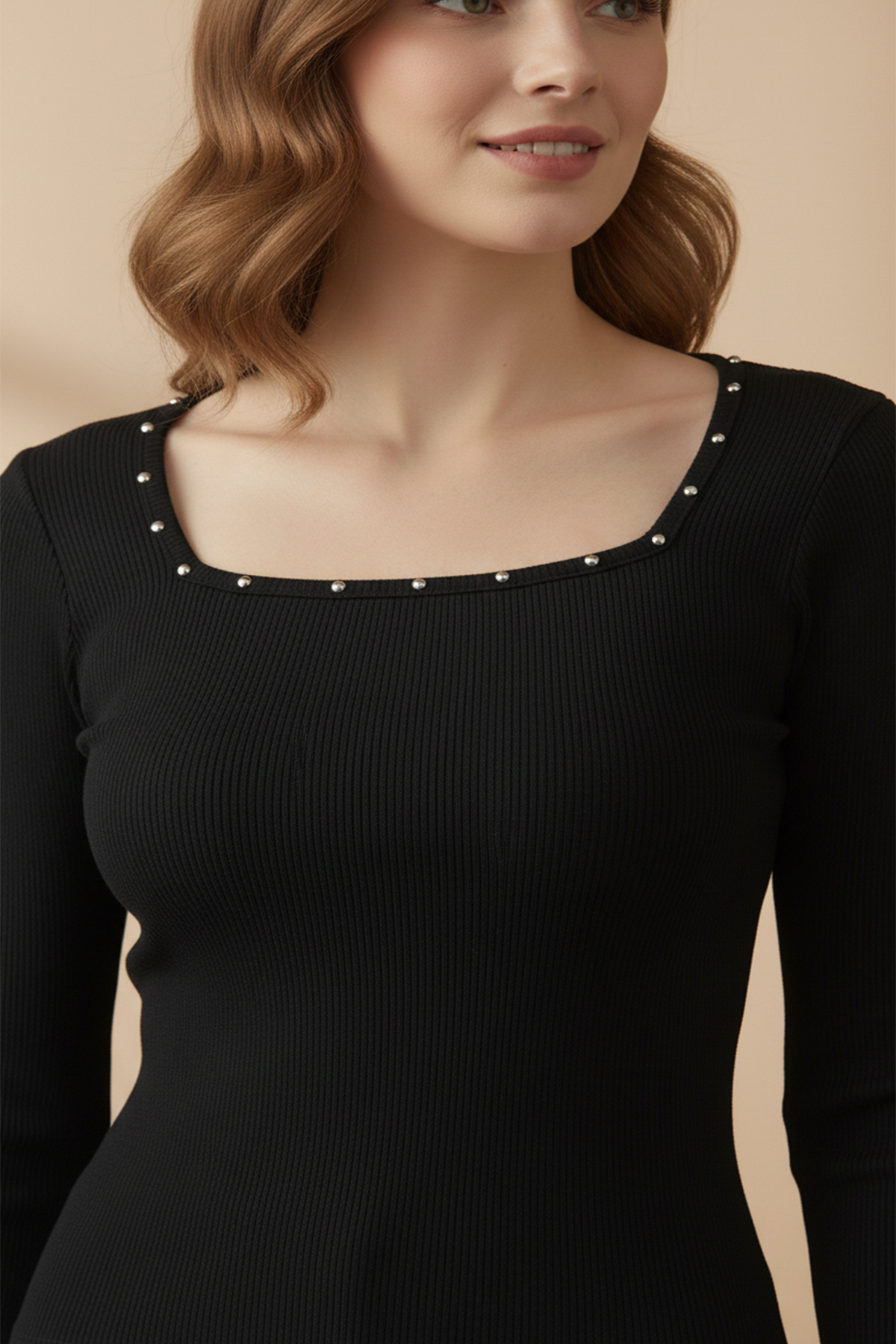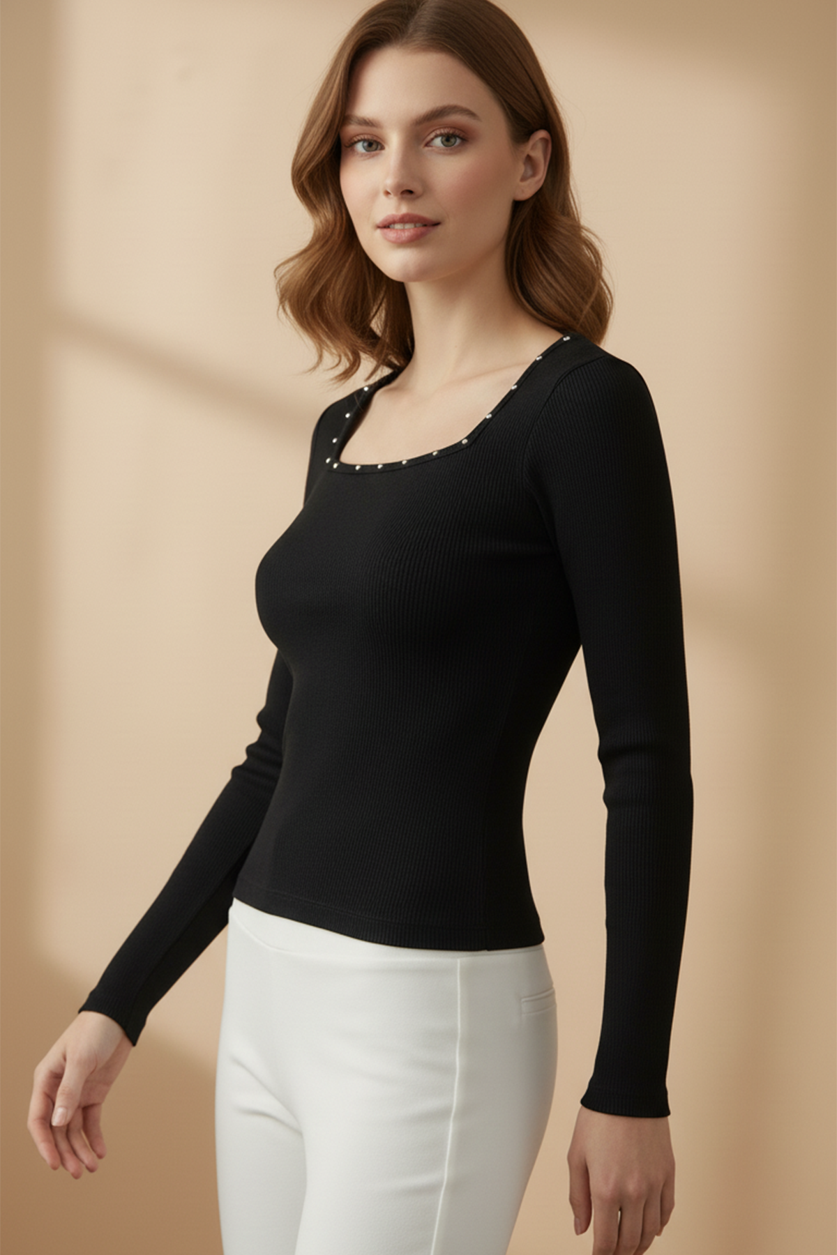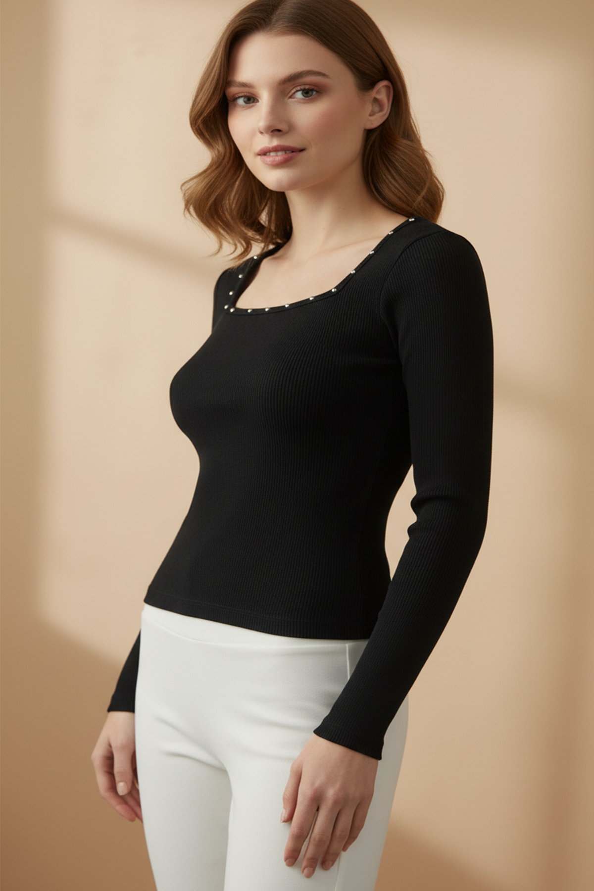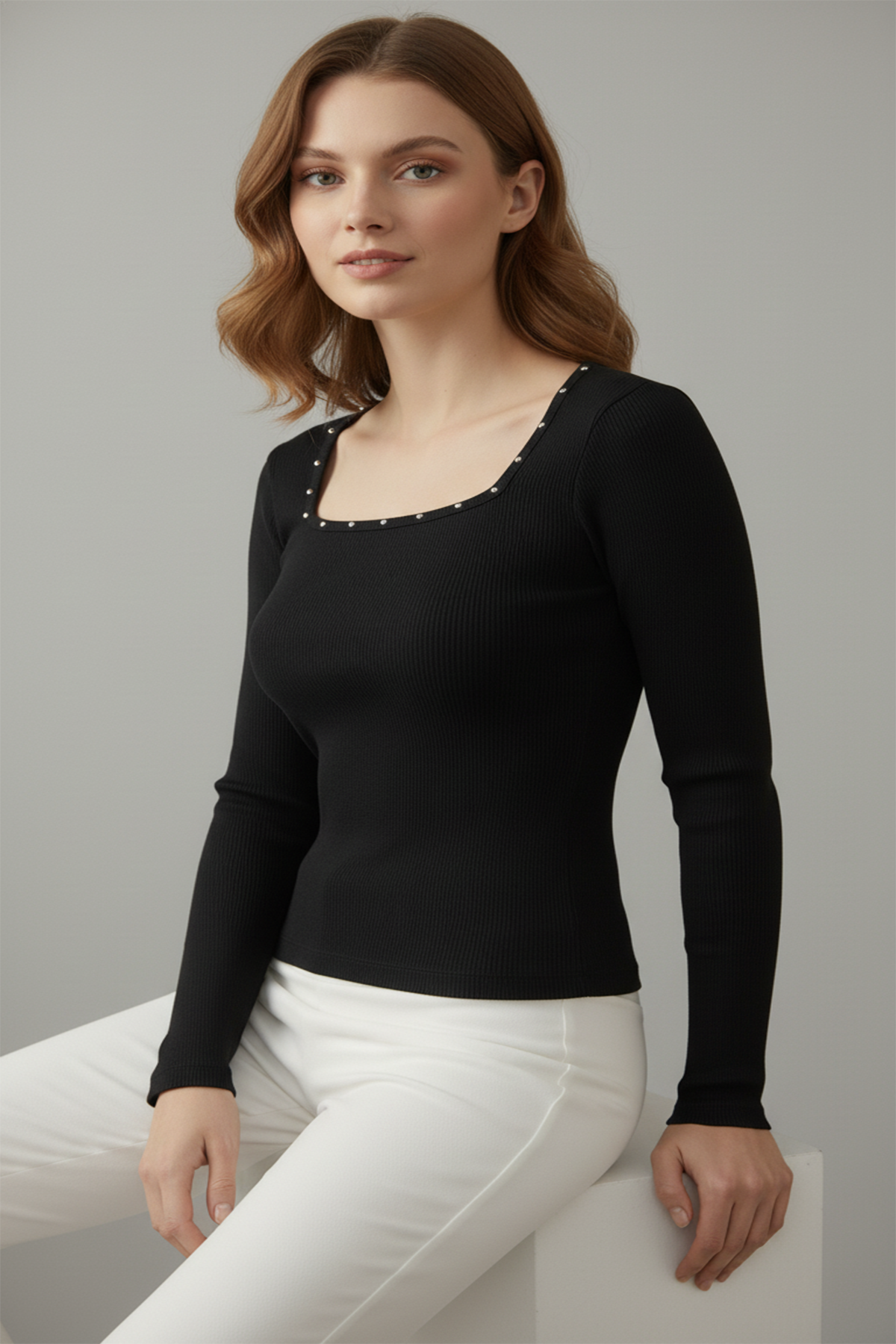 Zarif görünümüyle öne çıkan kare yaka inci çakmalı fitilli kaşkorse bluz, hem şık hem konforlu bir stil sunar. Esnek ve pamuklu dokusuyla vücudu nazikçe sarar, günlük kullanımdan özel davetlere kadar her ortamda rahat bir şekilde kombinlenebilir.