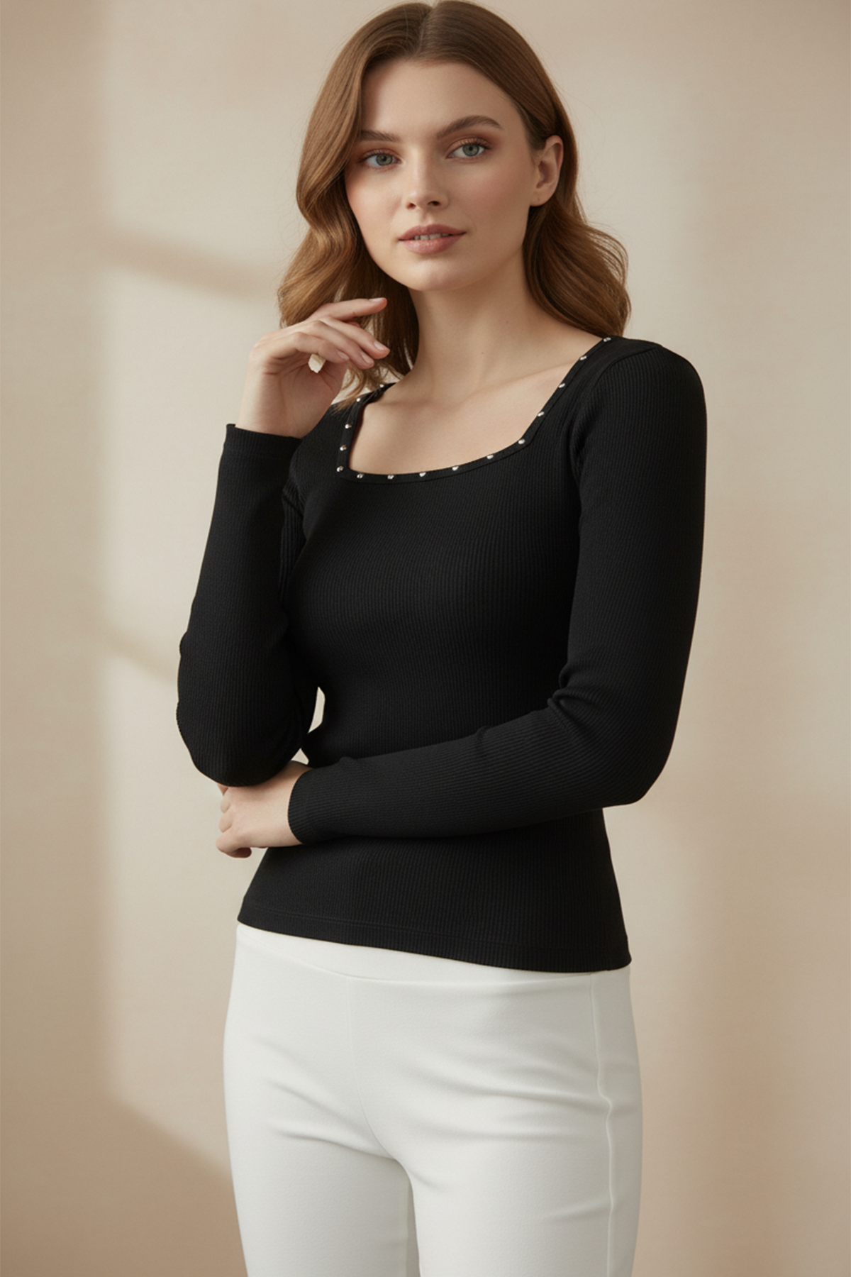 Kare Yaka İnci Çakmalı Fitilli Kaşkorse Bluz – Siyah