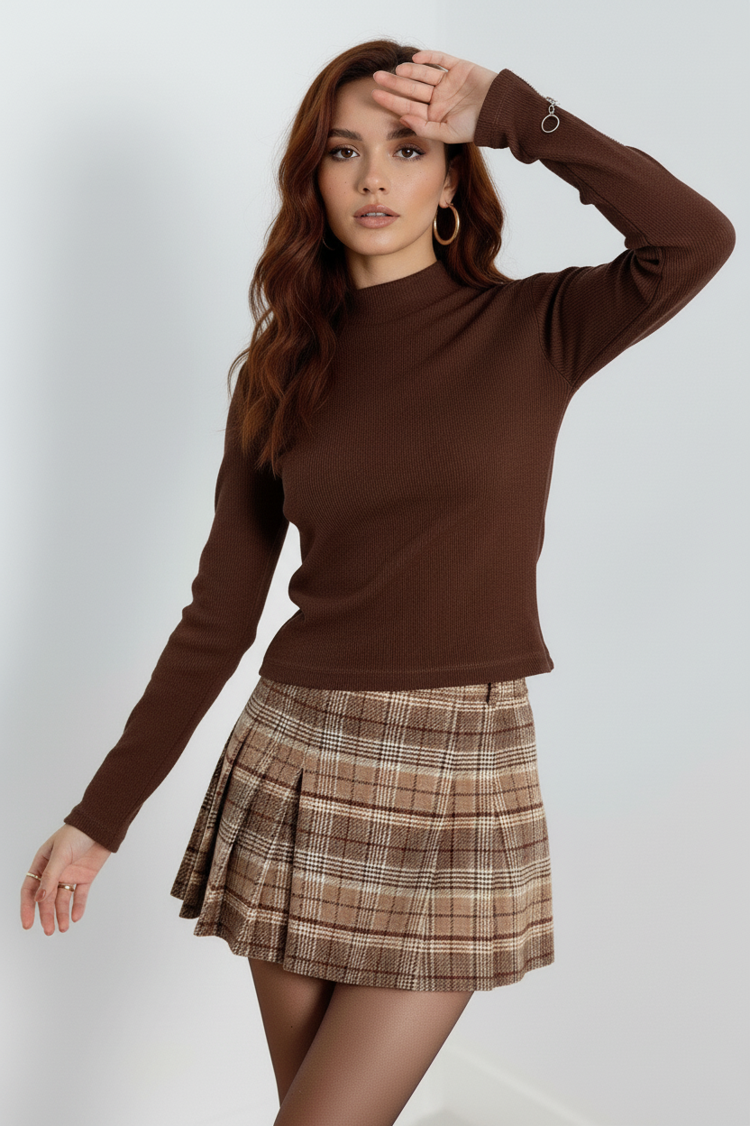 Kaşkorse Kol Fermuarlı Balıkçı Yaka Bluz – Kahverengi