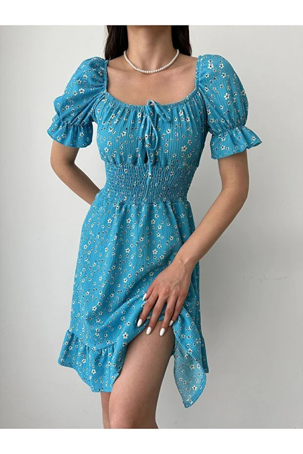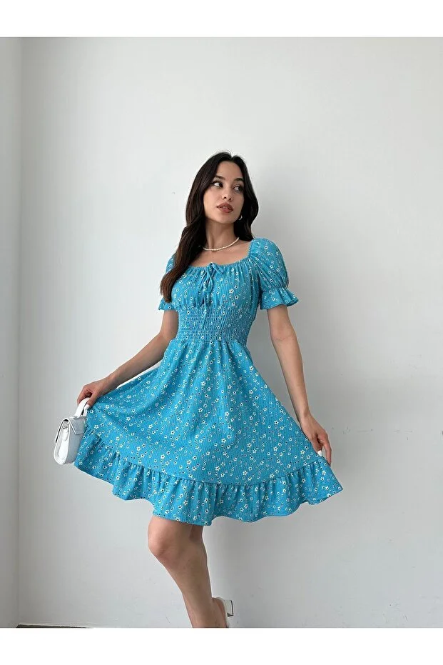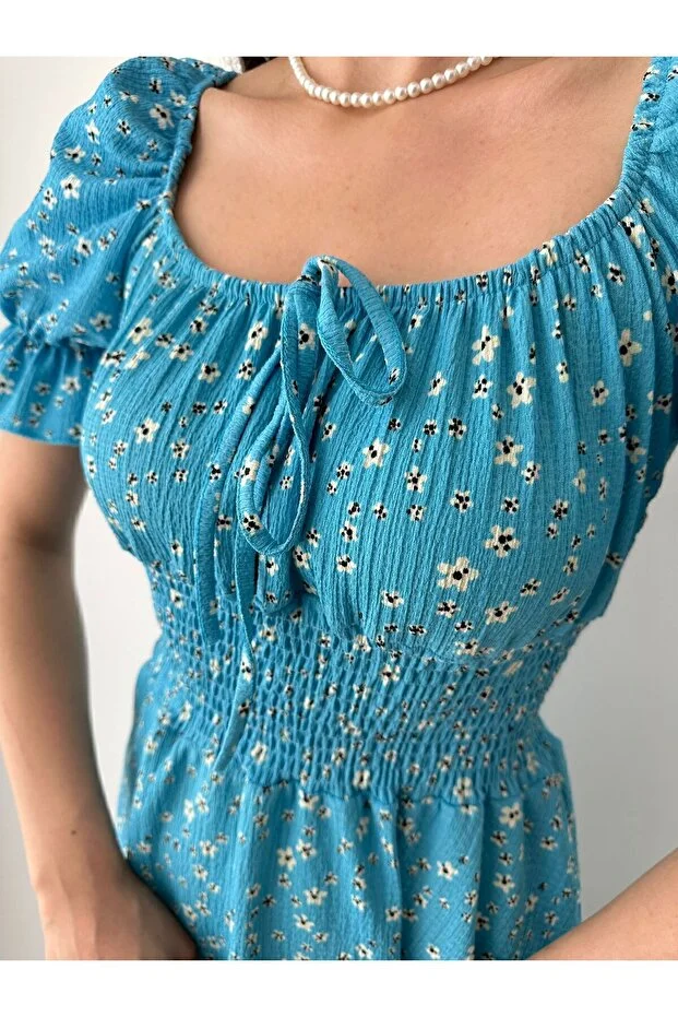 Kayık Yaka Çiçek Desenli Bürümcük Mini Elbise – Mavi