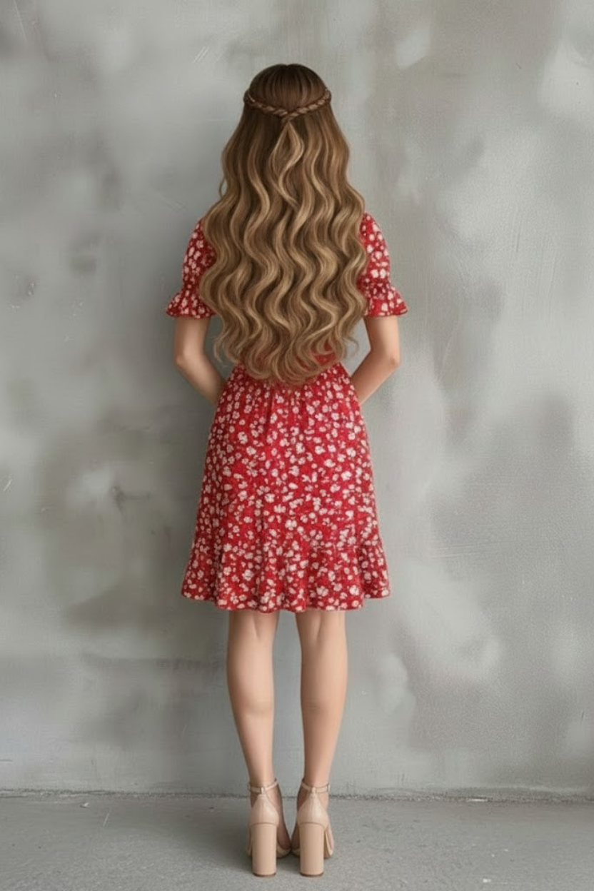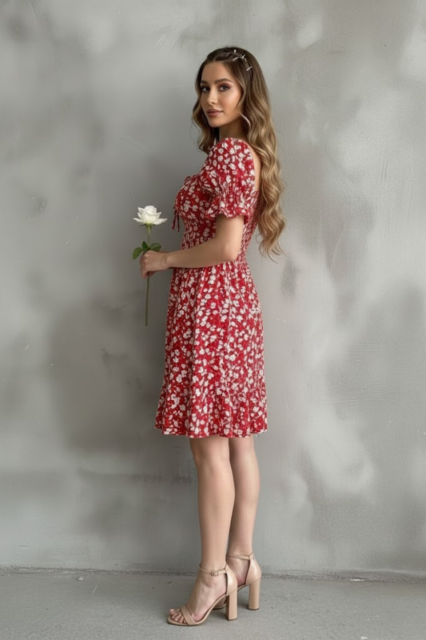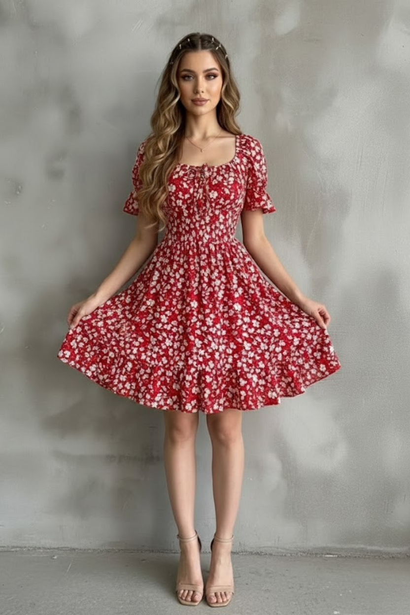 Kırmızı çiçek desenleriyle süslenmiş gipeli bürümcük elbise, zarif tasarımıyla şıklık sunar.