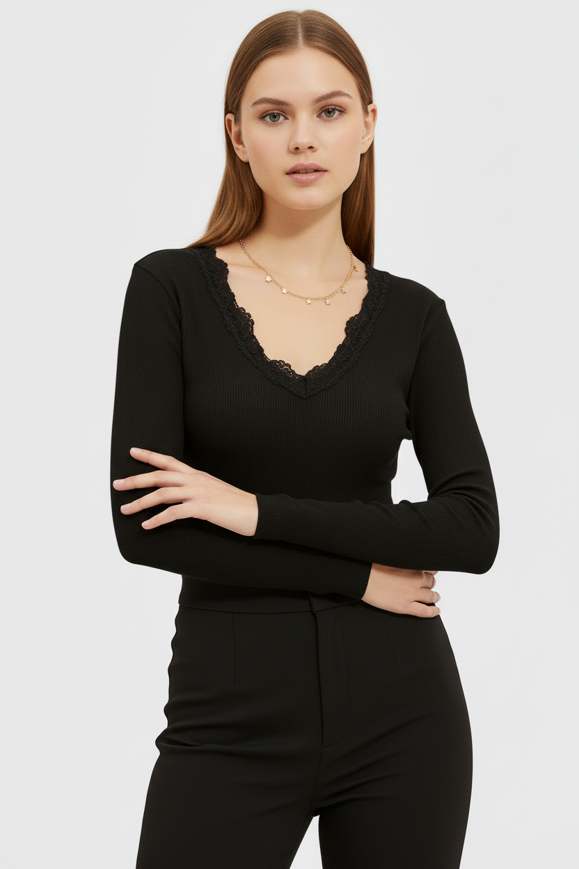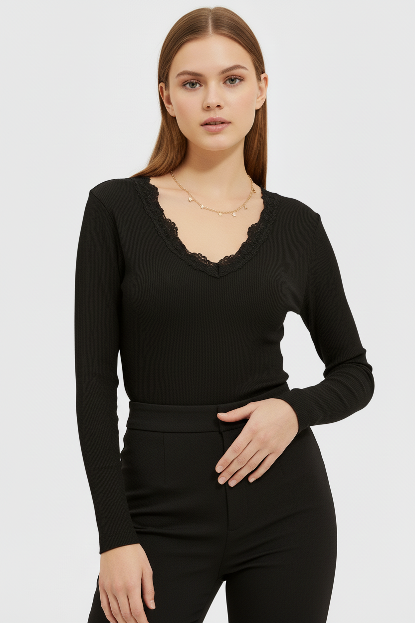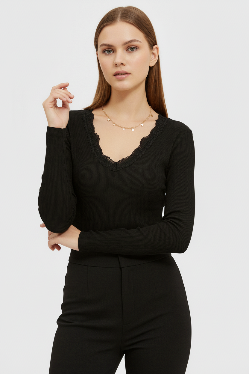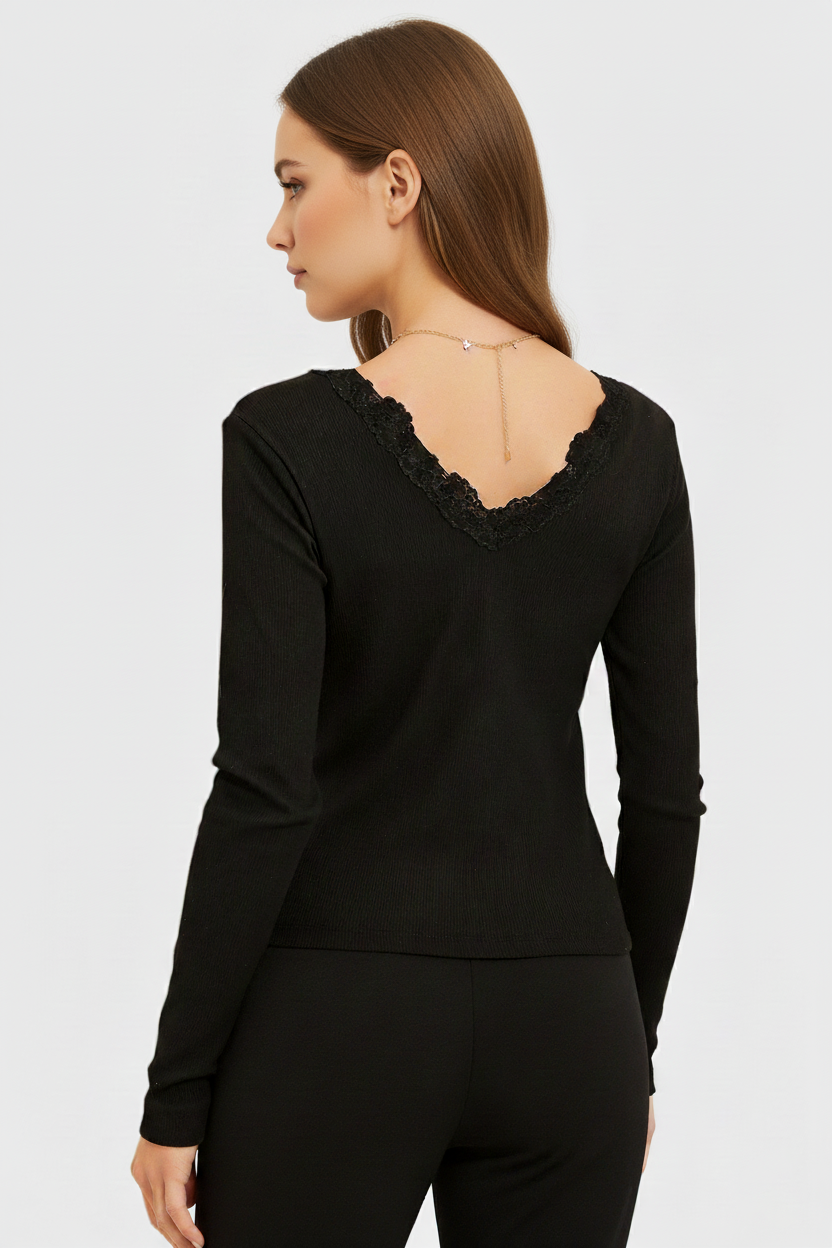 Önü ve Arkası V Yaka Dantel Detaylı Kaşkorse Pamuklu Uzun Kollu Bluz – Siyah