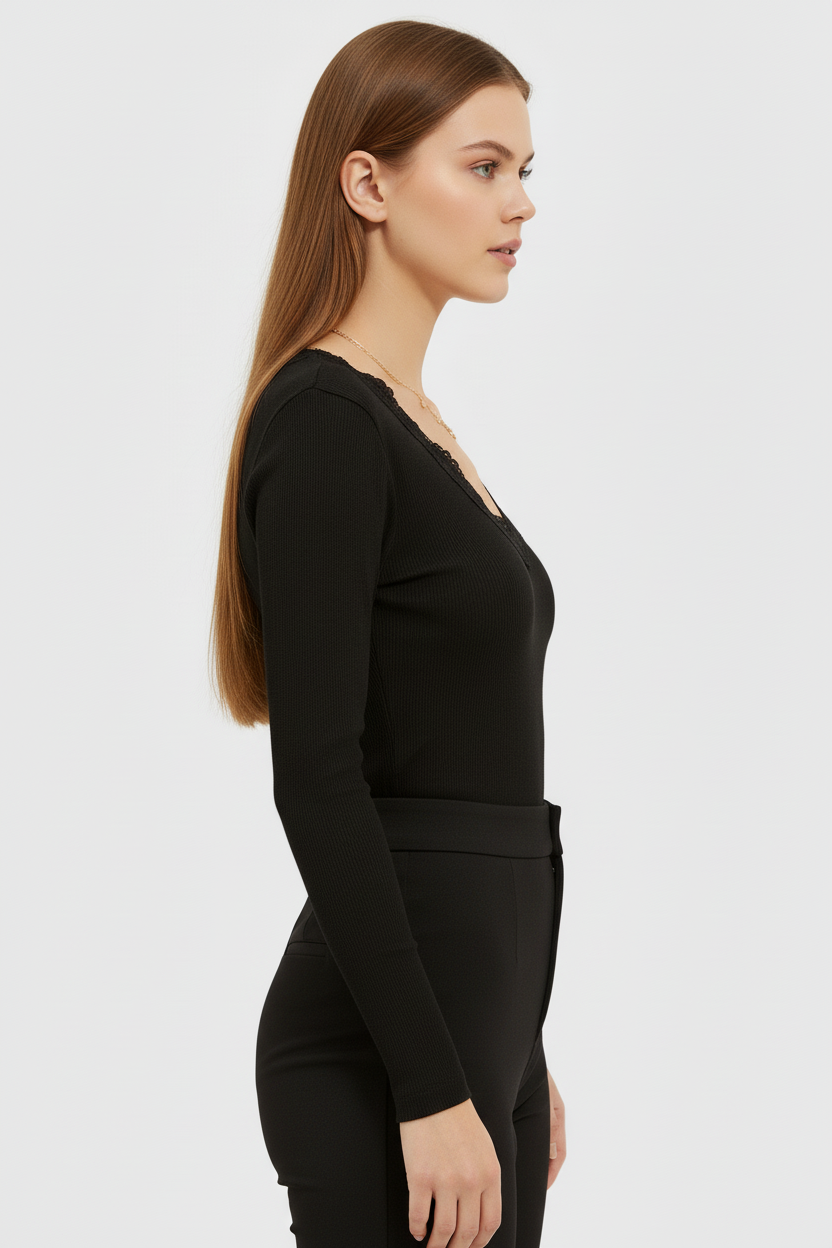 Hem önü hem arkası V yaka formu ve ince dantel detayları, feminen bir görünüm oluşturur. Kaşkorse örme kumaşı vücuda oturur, formunu korur ve Slim Fit kalıbıyla zarif bir siluet kazandırır. Günlük kombinlerden özel davetlere kadar her ortamda rahatlıkla kullanılabilir.