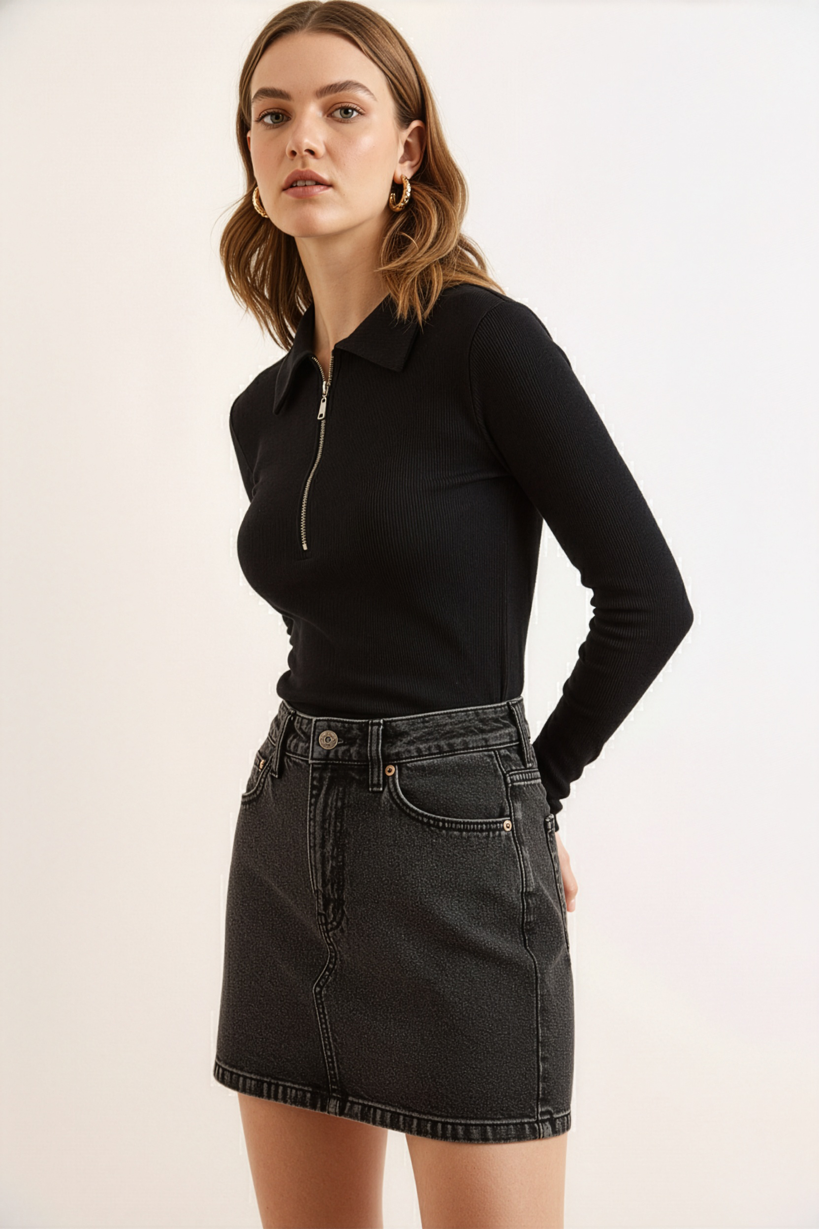 Siyahın asil duruşunu jean, etek veya kumaş pantolonlarla tamamlayarak zamansız bir şıklık yakalayabilirsiniz. Fermuarlı yaka detayı, sade kombinlere modern bir dokunuş katar.