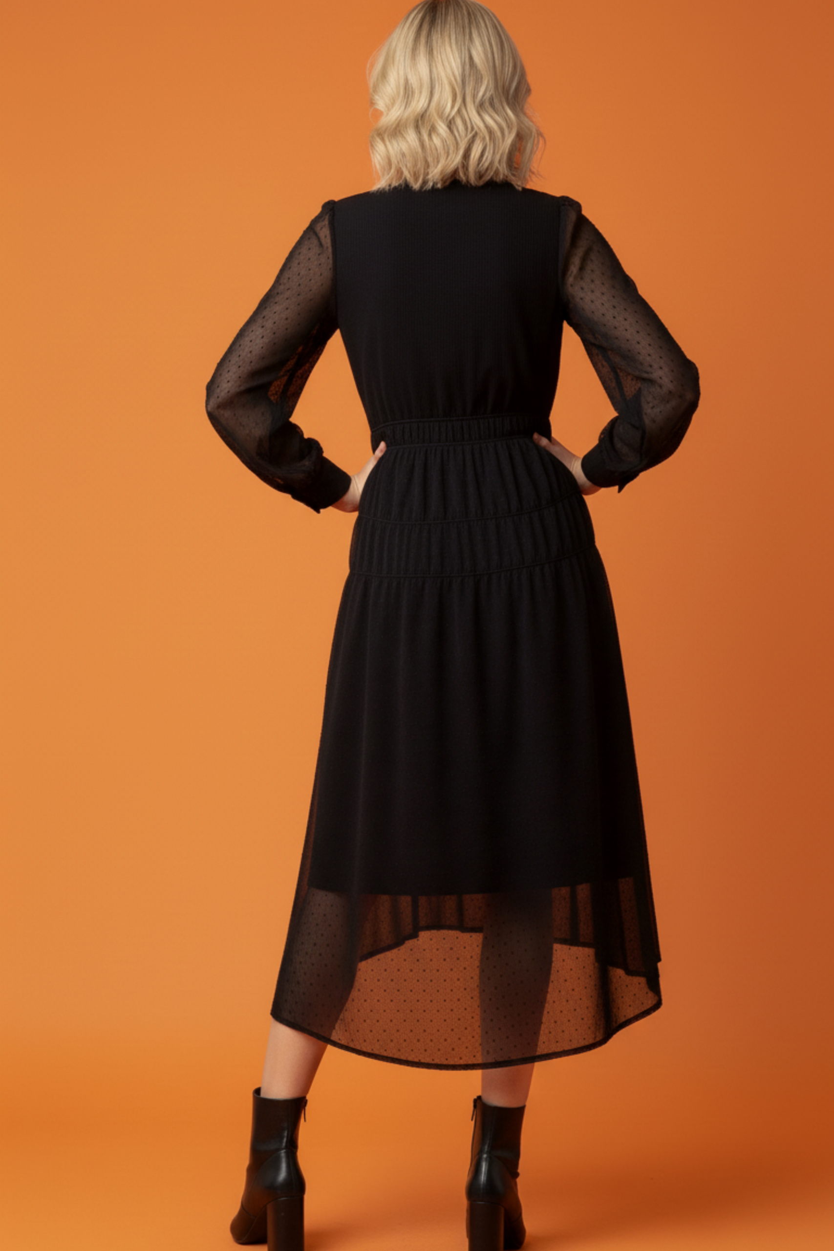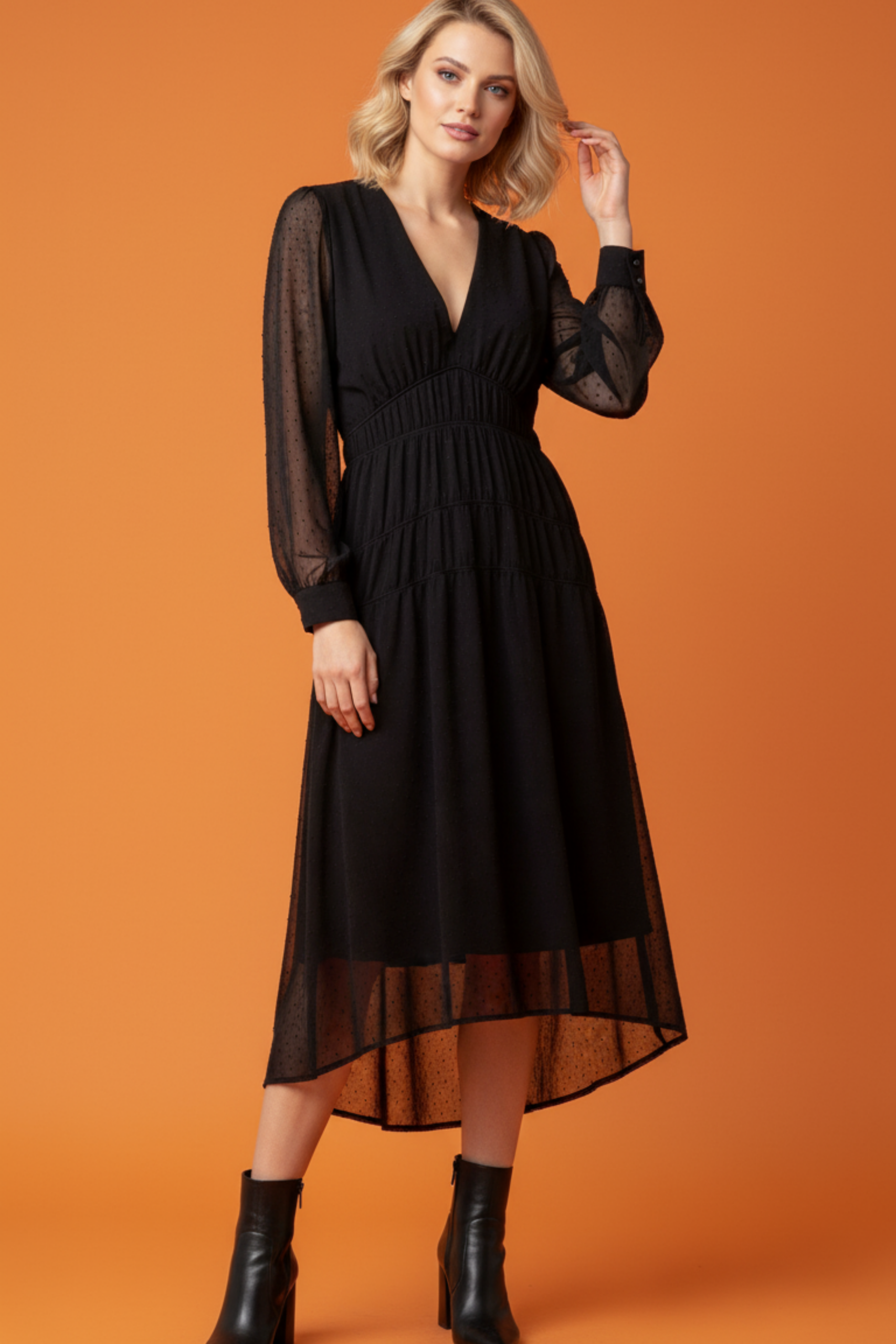 Siyah Tül Detaylı Büzgülü V Yaka Midi Elbise