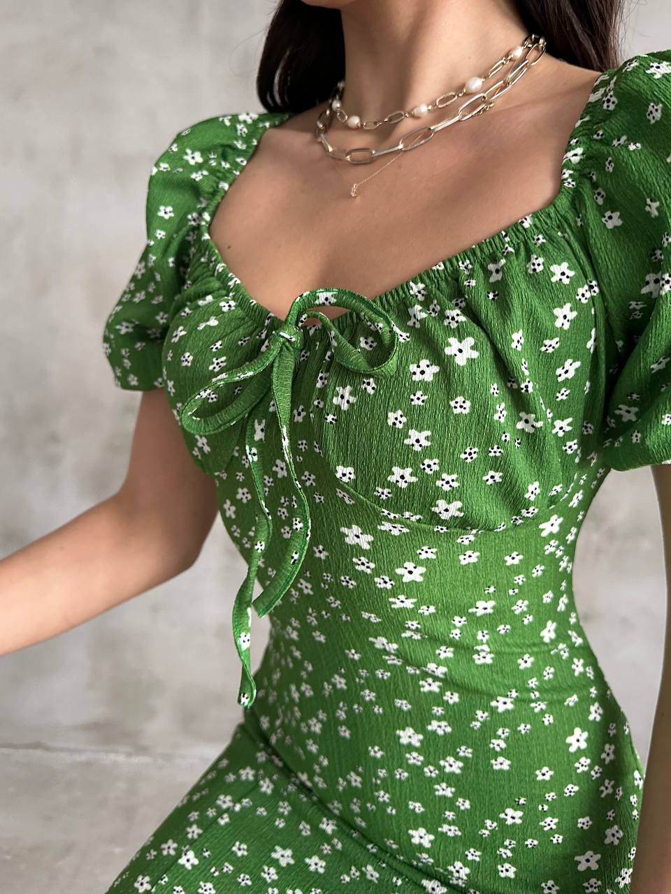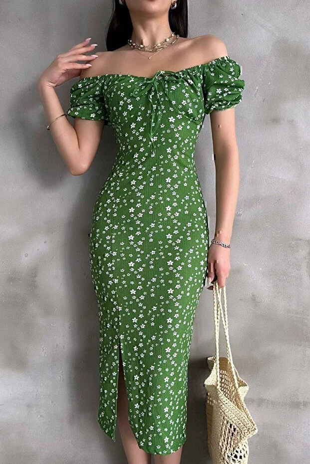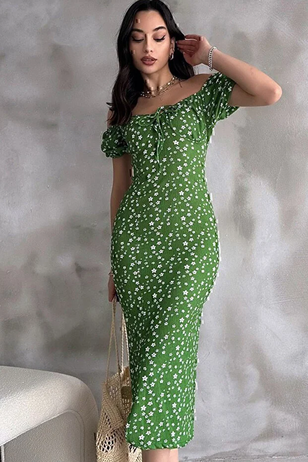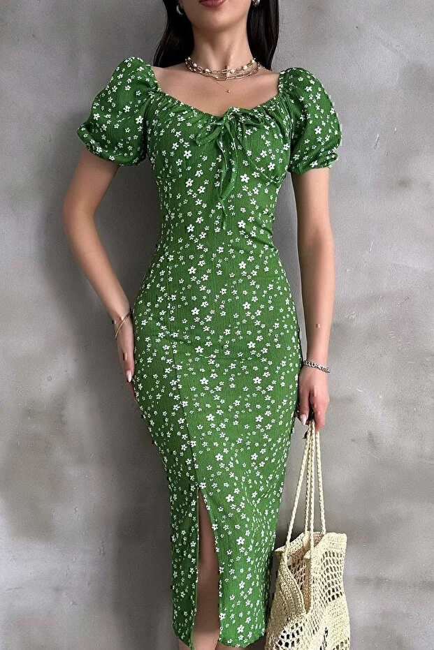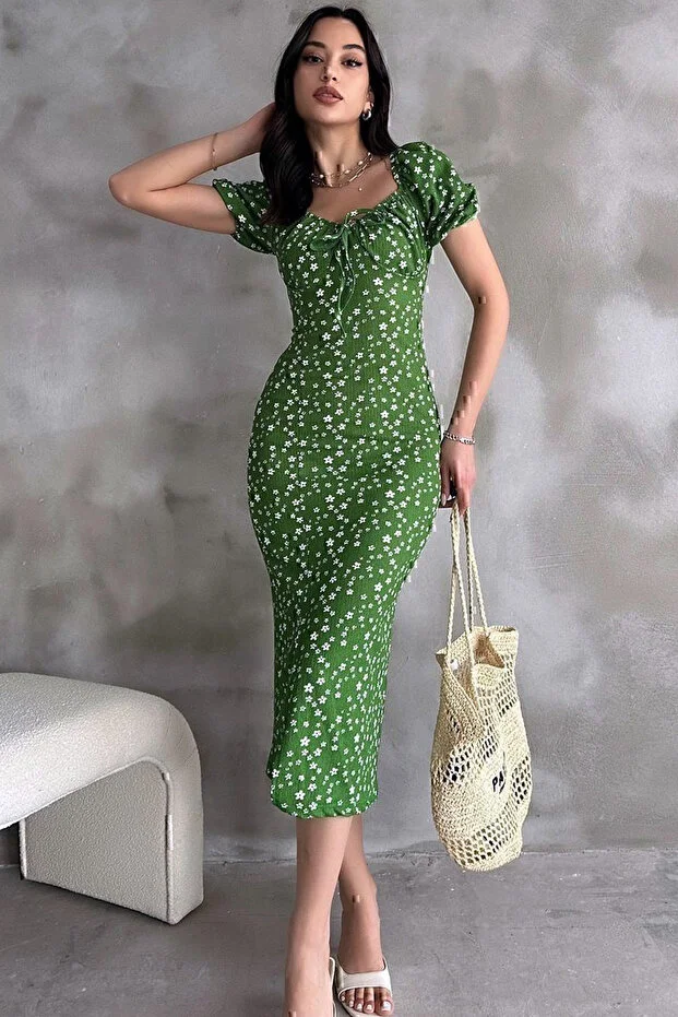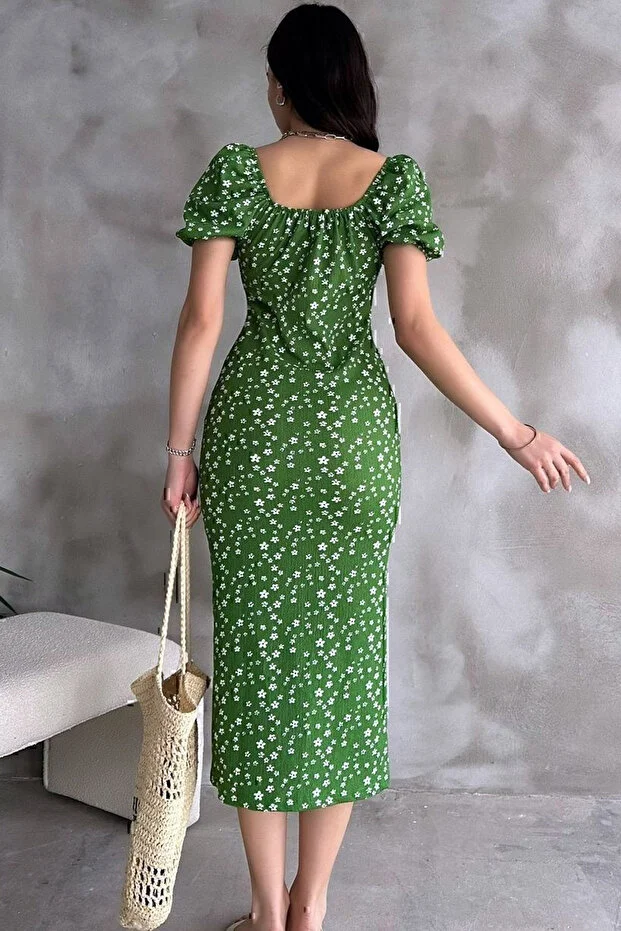 Yeşil Lastikli U Kare Yakalı Kısa Kollu Fit Kalıp Kurdelalı Likralı Çiçek Desen Yırtmaçlı Diz Altı Elbise