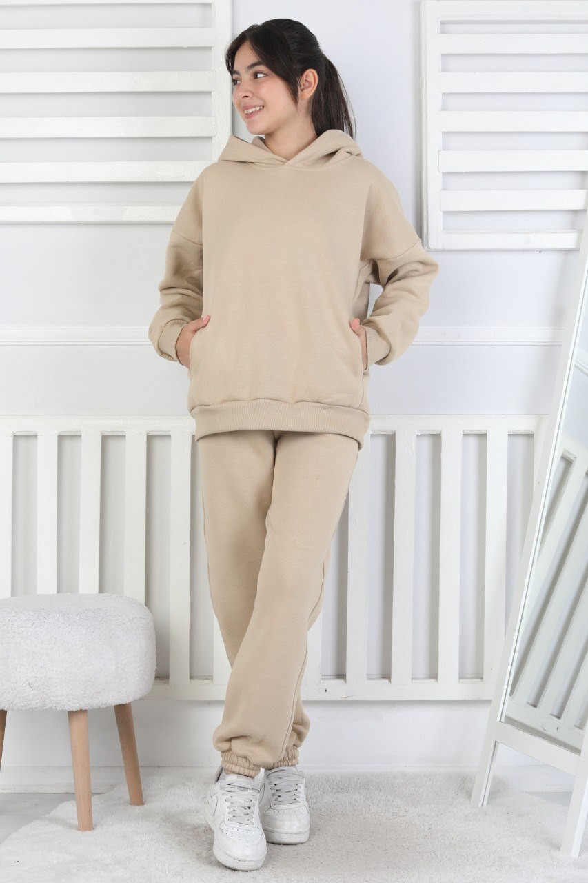 Şardonlu 3 İplik Baskılı Kapşonlu Kız Çocuk Bej İkili Takım