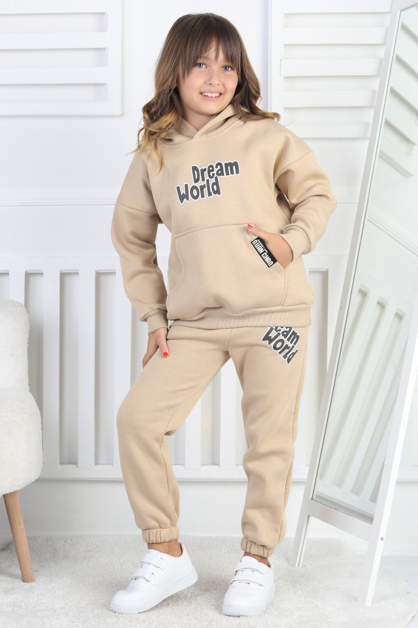 Şardonlu 3 İplik Baskılı Kapşonlu Kız Çocuk Bej Takım