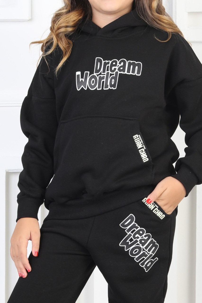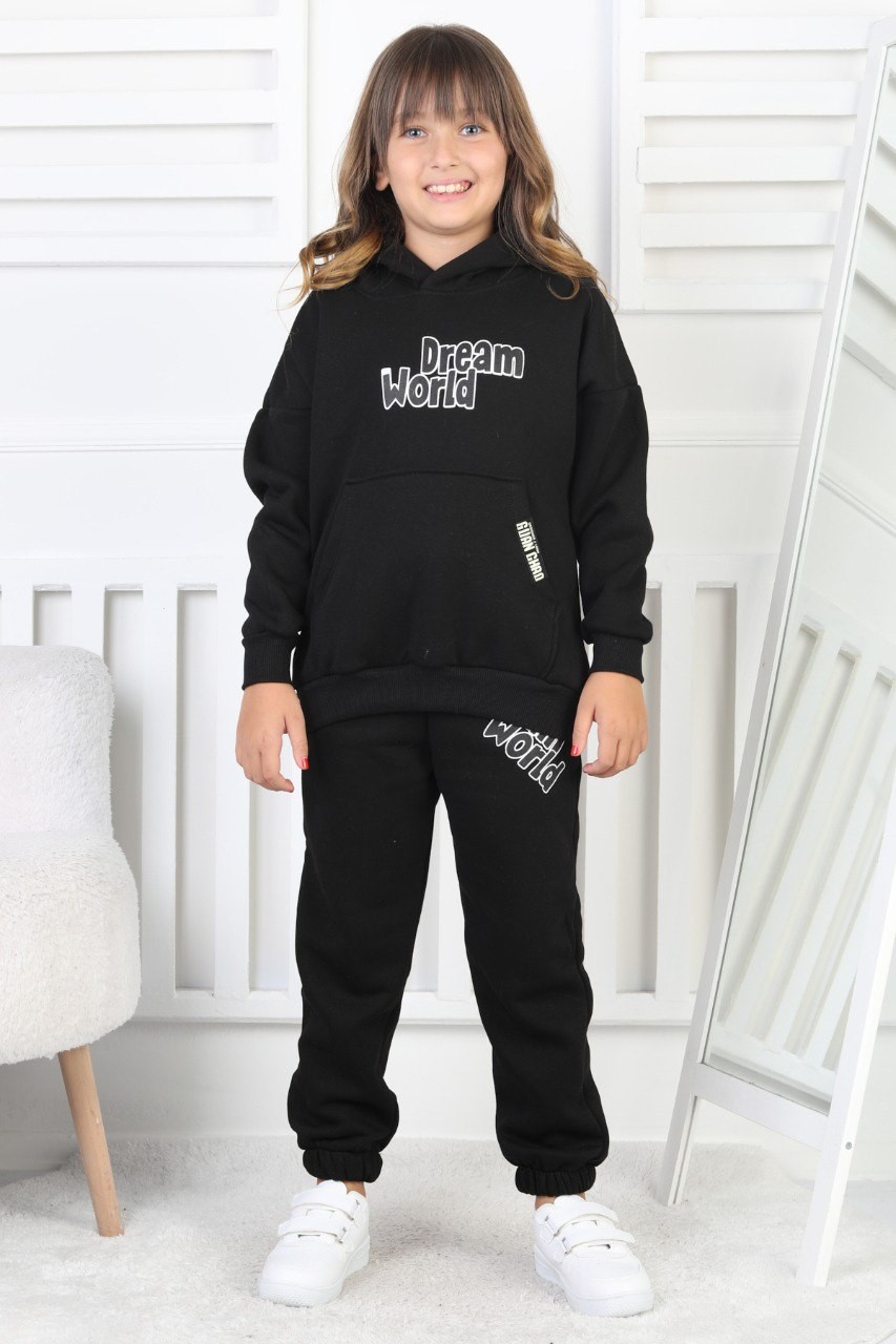 Şardonlu 3 İplik Baskılı Kapşonlu Kız Çocuk Siyah Takım