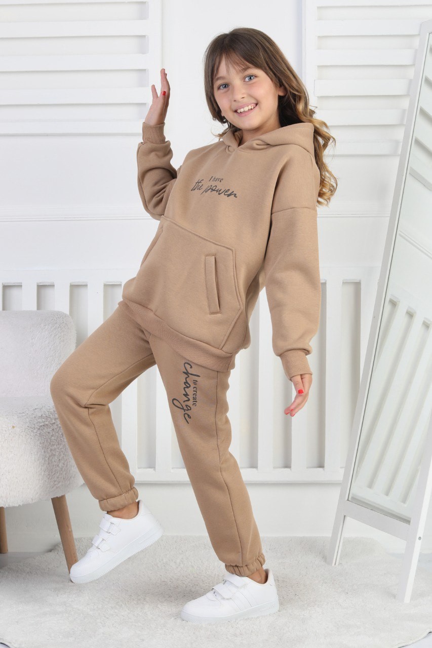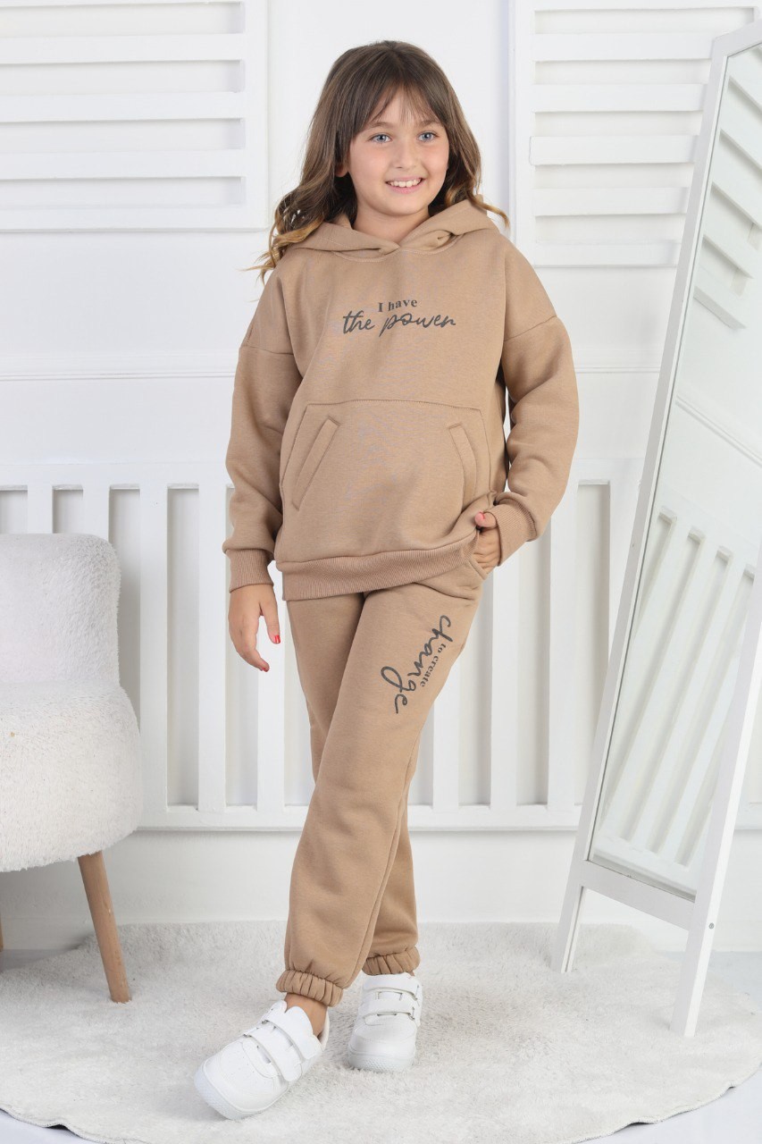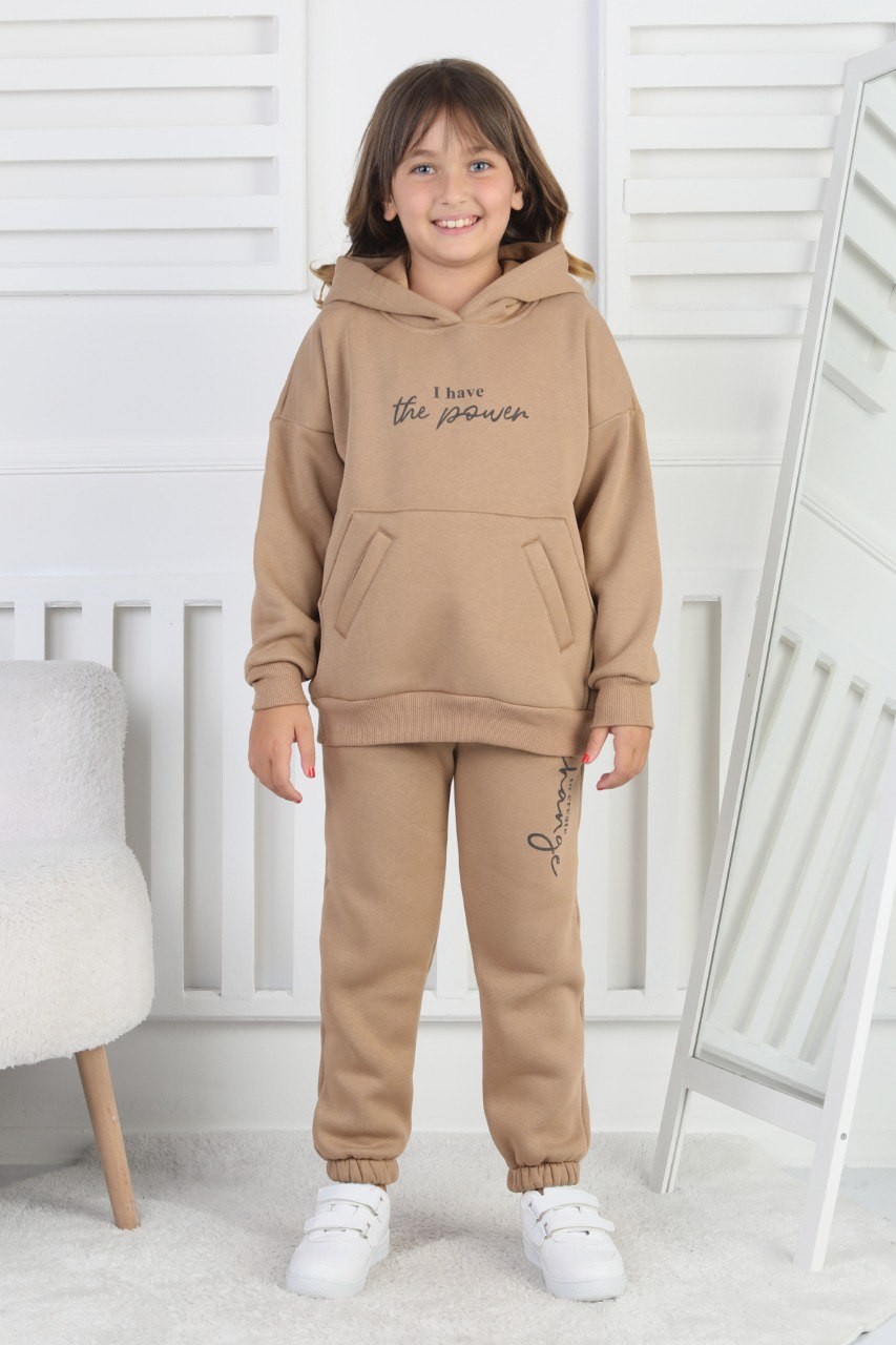 Şardonlu 3 İplik Baskılı Kız Çocuk Vizon Rengi İkili Takım