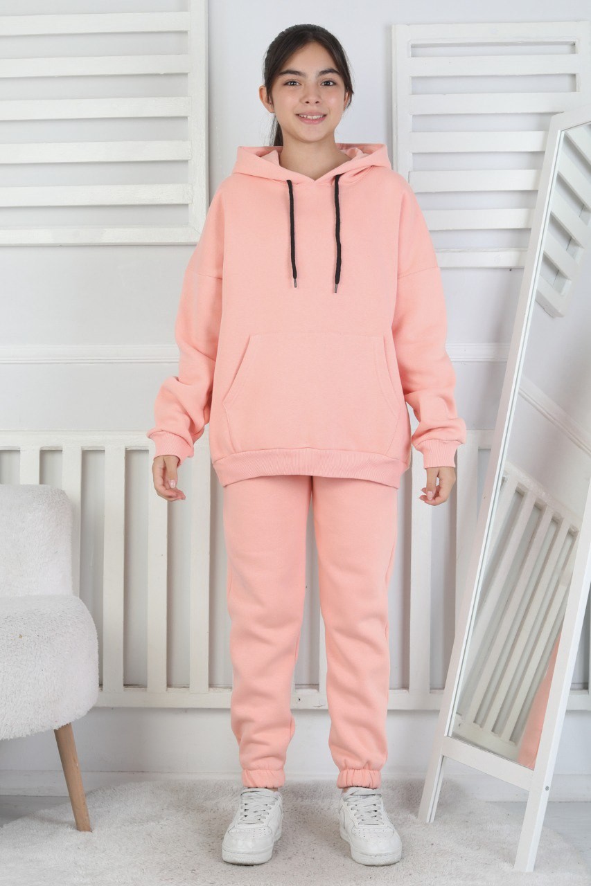 Şardonlu 3 İplik Kapşonlu Kız Çocuk Pudra İkili Takım