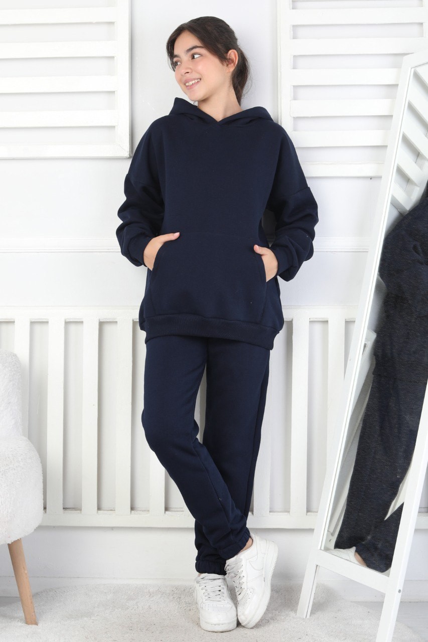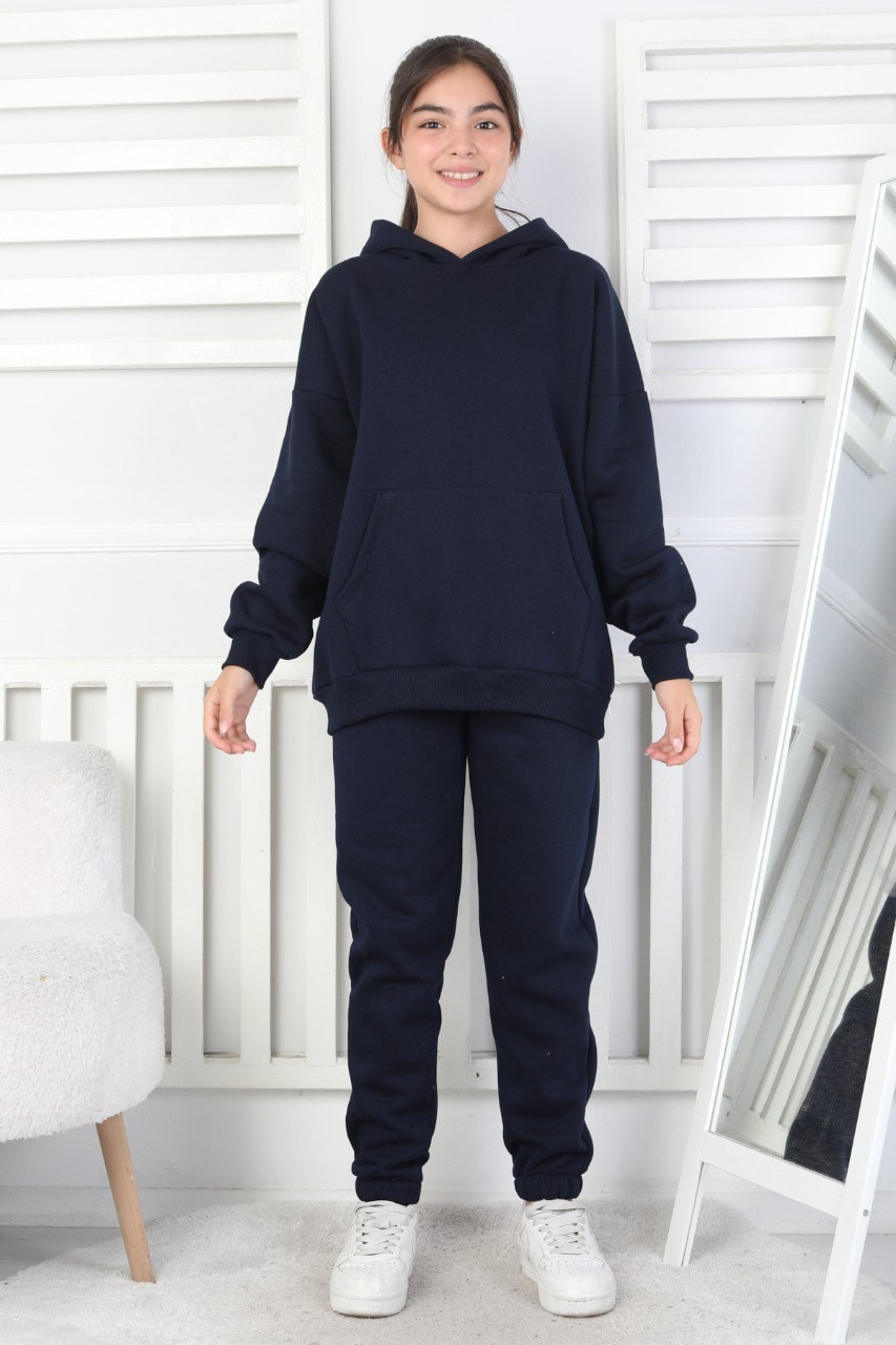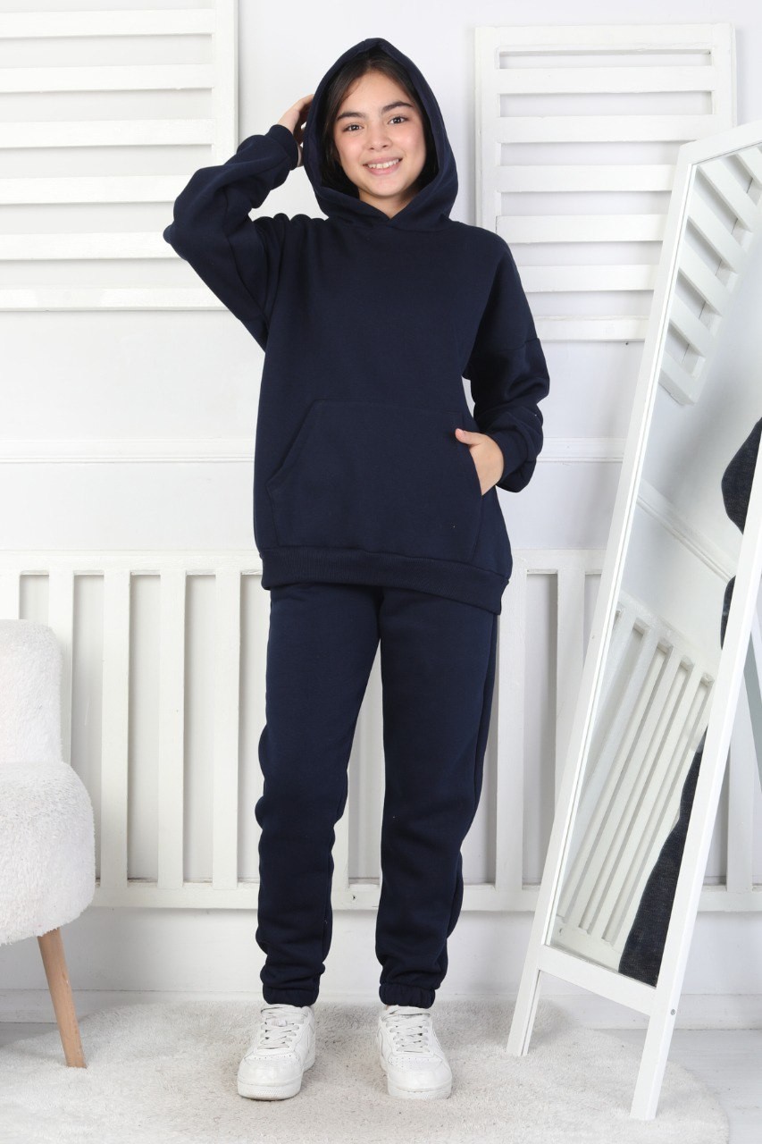 Şardonlu 3 İplik Kapşonlu Lacivert Kız Çocuk İkili Takım
