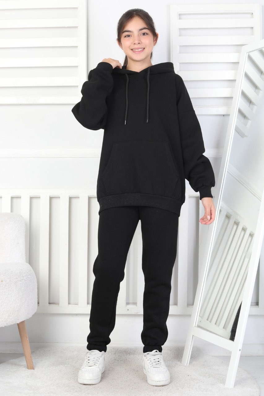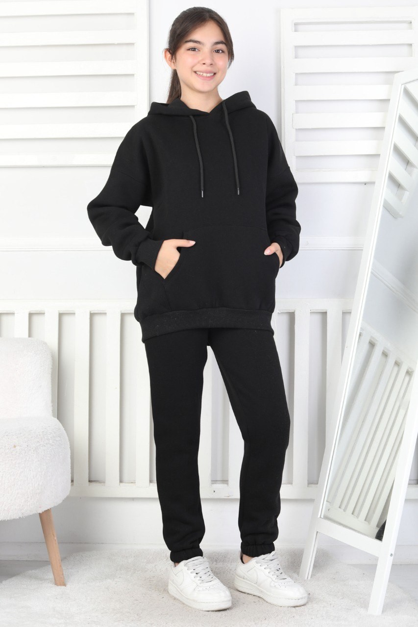 Şardonlu 3 İplik Kapşonlu Siyah Kız Çocuk İkili Takım