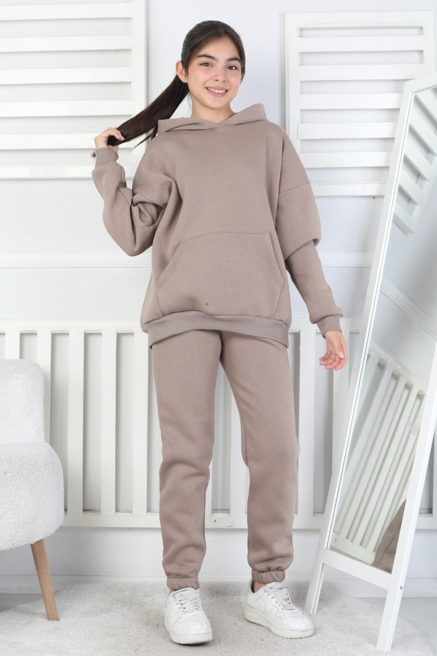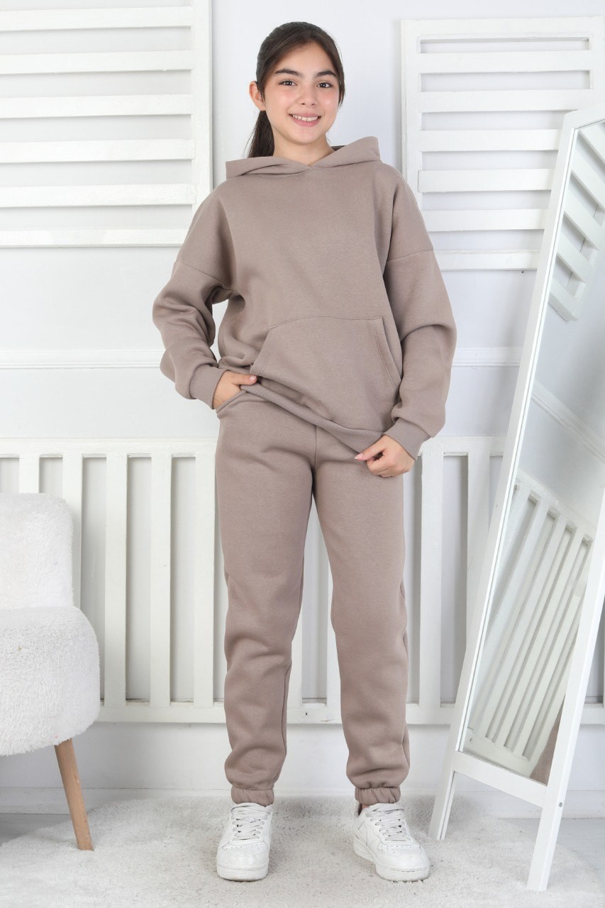 Şardonlu 3 İplik Kapşonlu Vizon Kız Çocuk İkili Takım