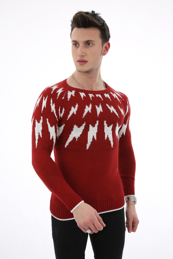 Şimşek Desenli Kırmızı Kalın Kışlık Günlük Triko Kazak