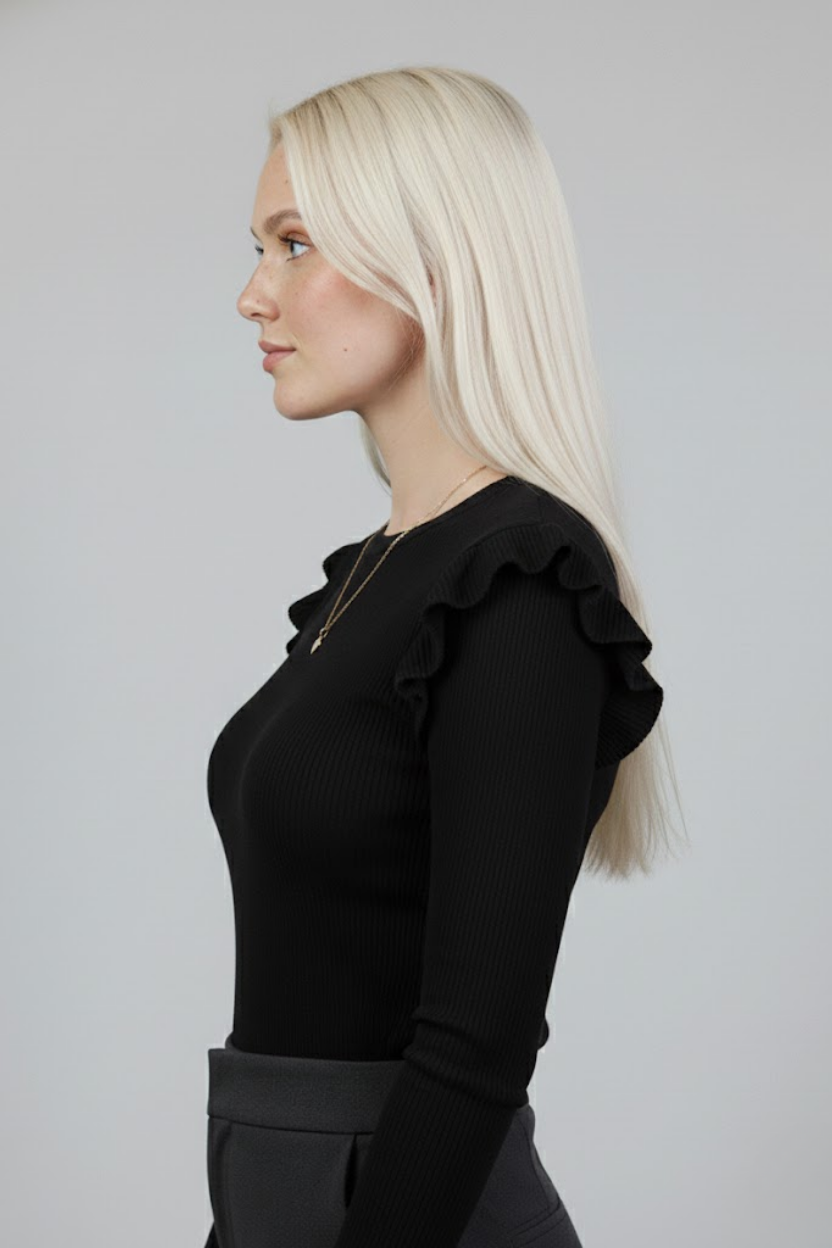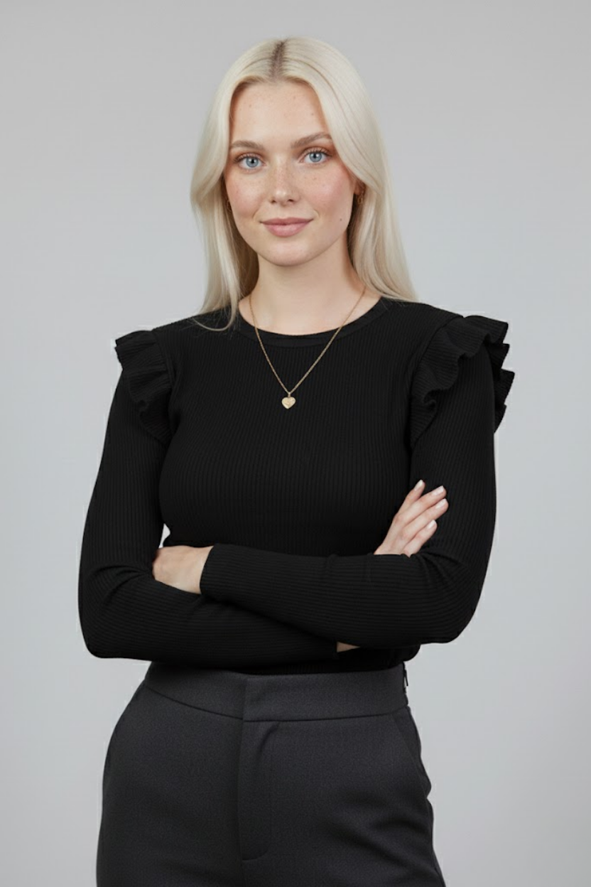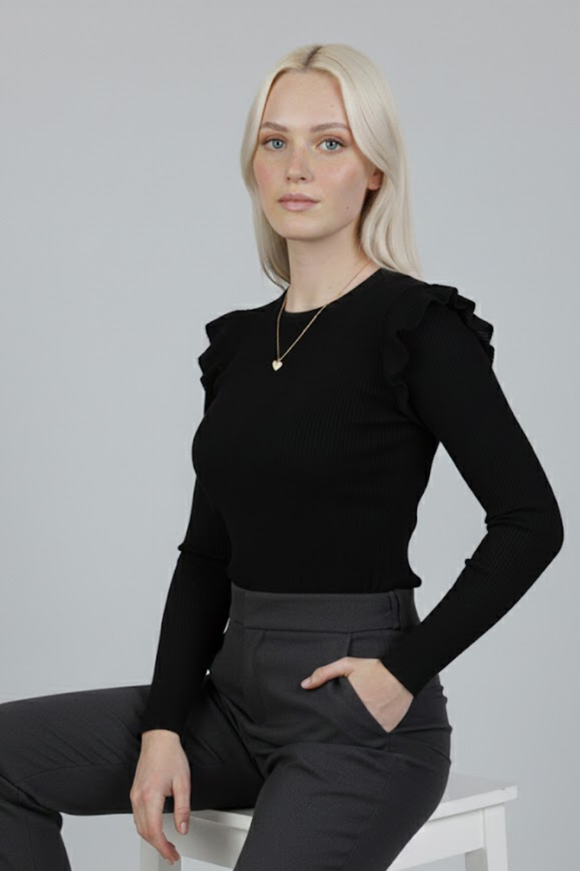 Siyah Kaşkorse Uzun Kollu Fırfırlı Omuz Detaylı Pamuklu Ribana Bluz