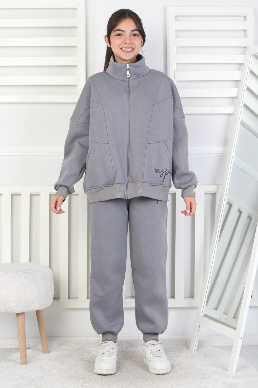 Üç İplik Fermuarlı Kız Çocuk Gri İkili Takım