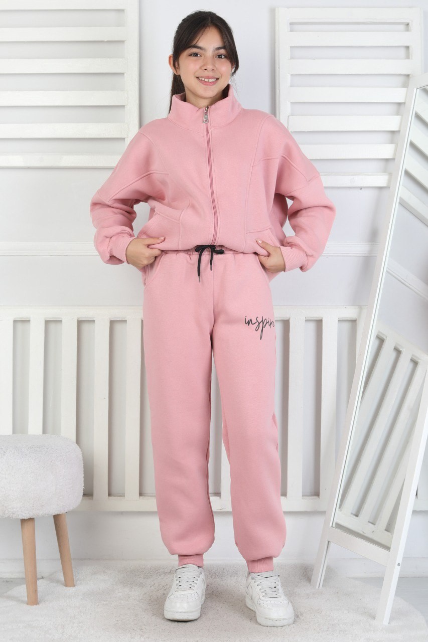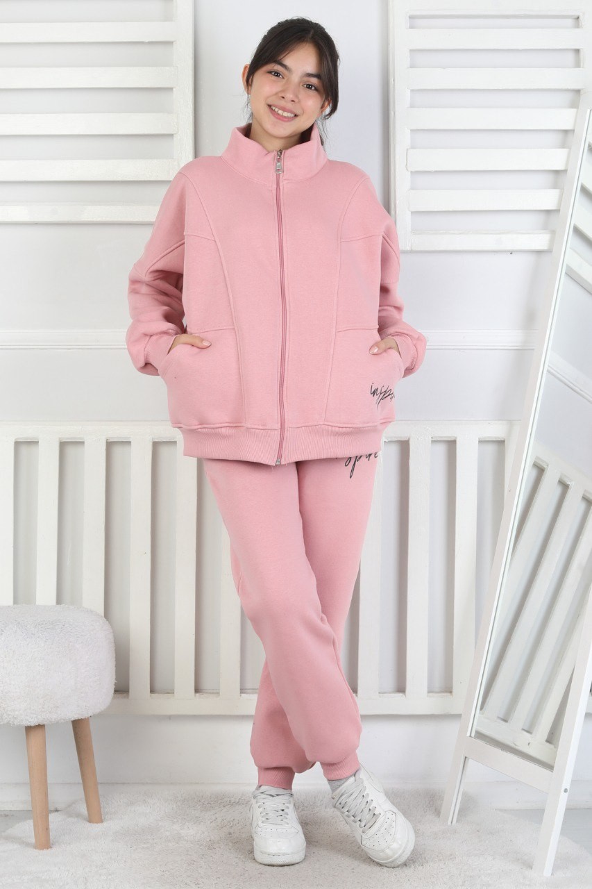 Üç İplik Fermuarlı Kız Çocuk Pembe İkili Takım