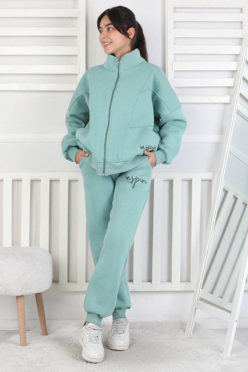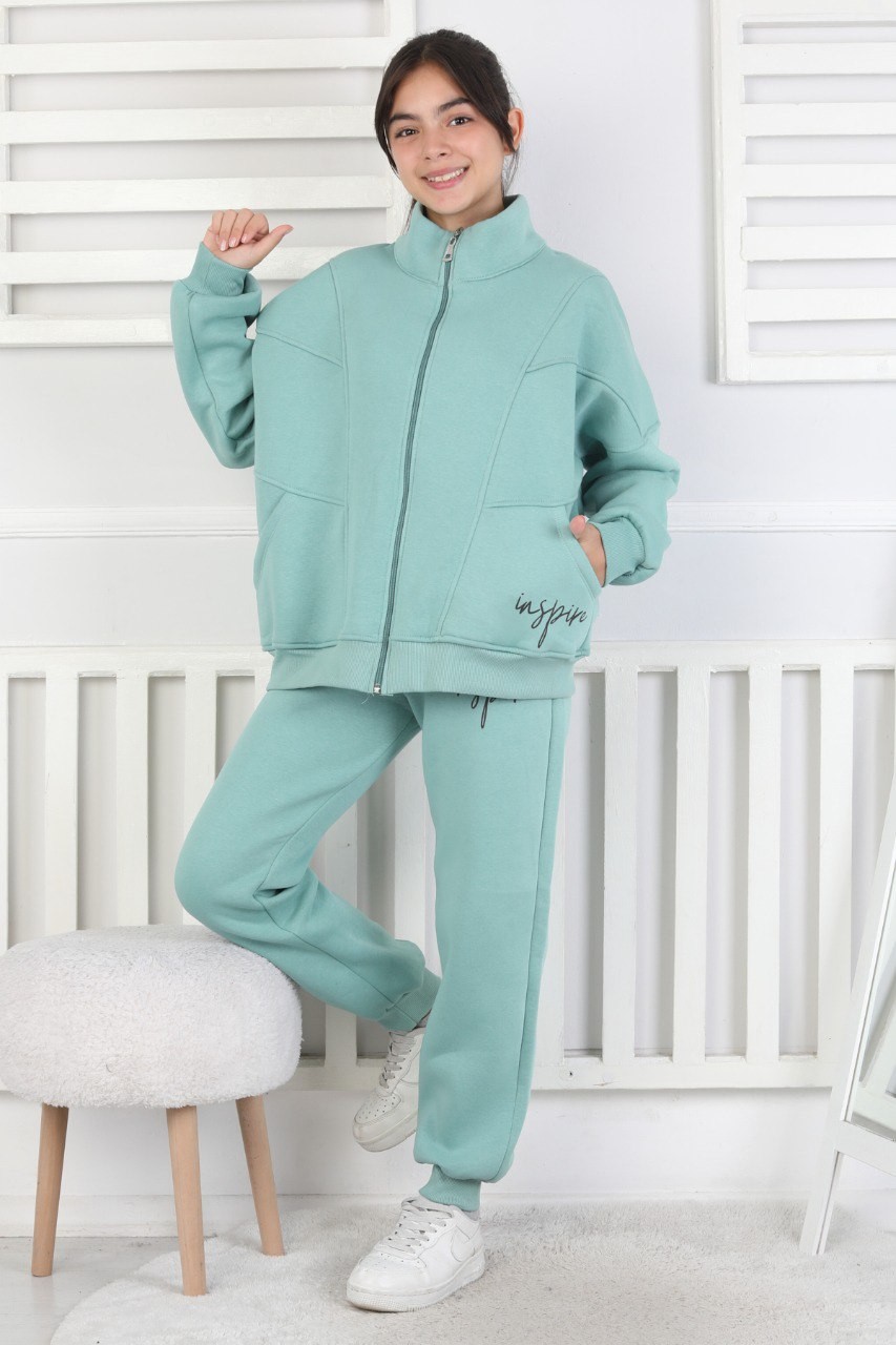 Üç İplik Fermuarlı Kız Çocuk Yeşil İkili Takım