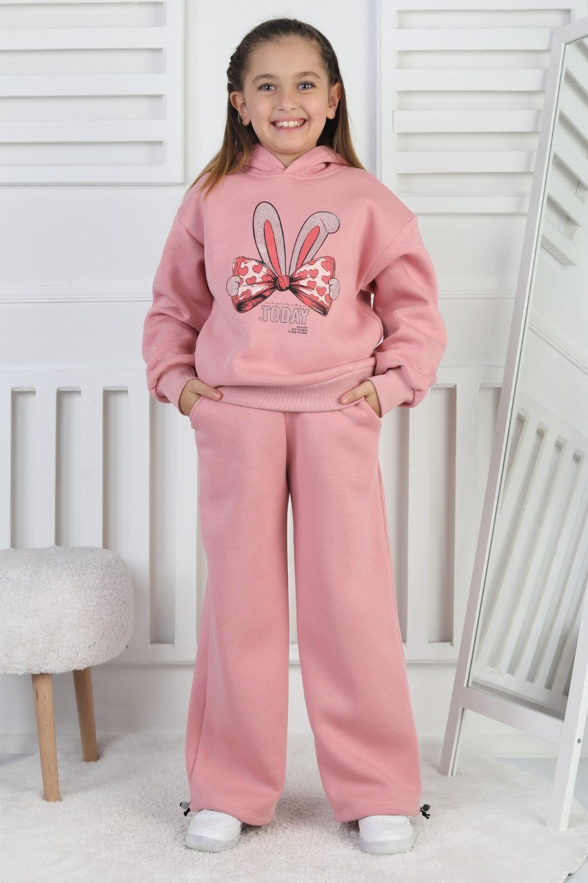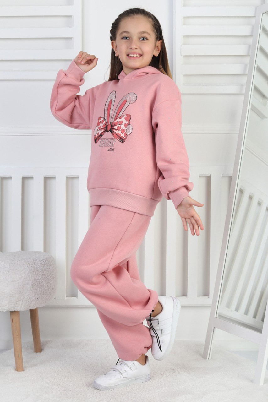 Üç İplik Şardonlu Baskılı Kapüşonlu Kız Çocuk Takım