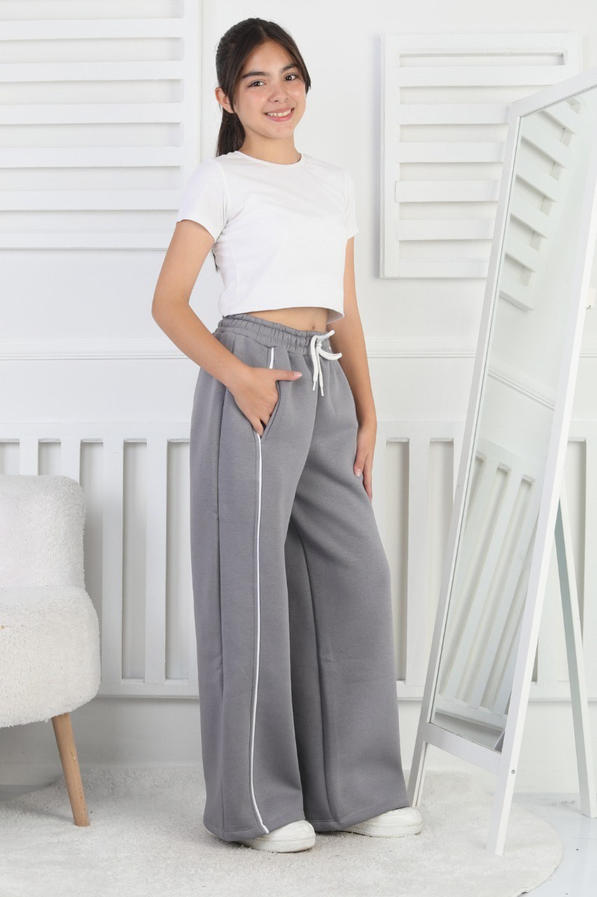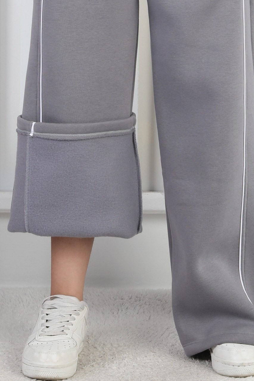 Üç İplik Şardonlu Bol Paça Tek Çizgi Kız Çocuk Gri Eşofman Altı