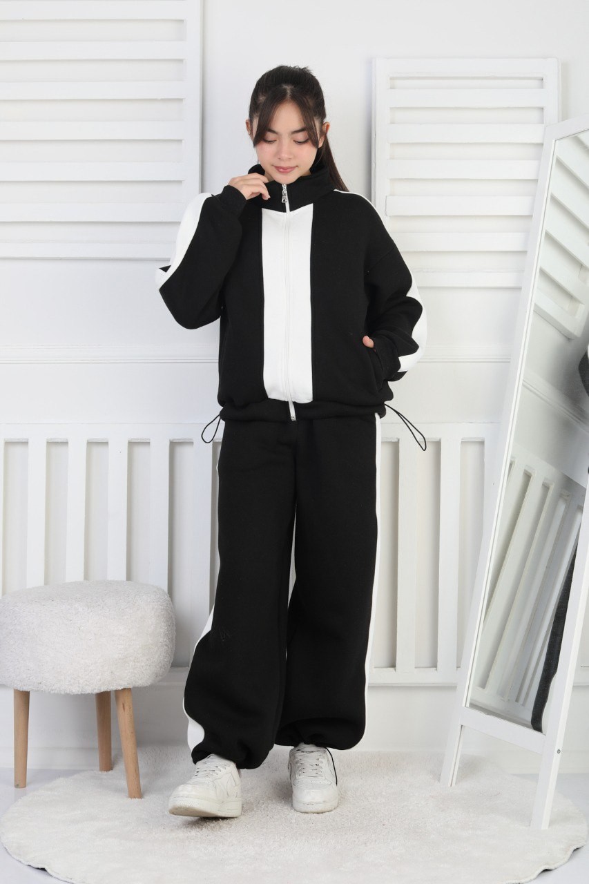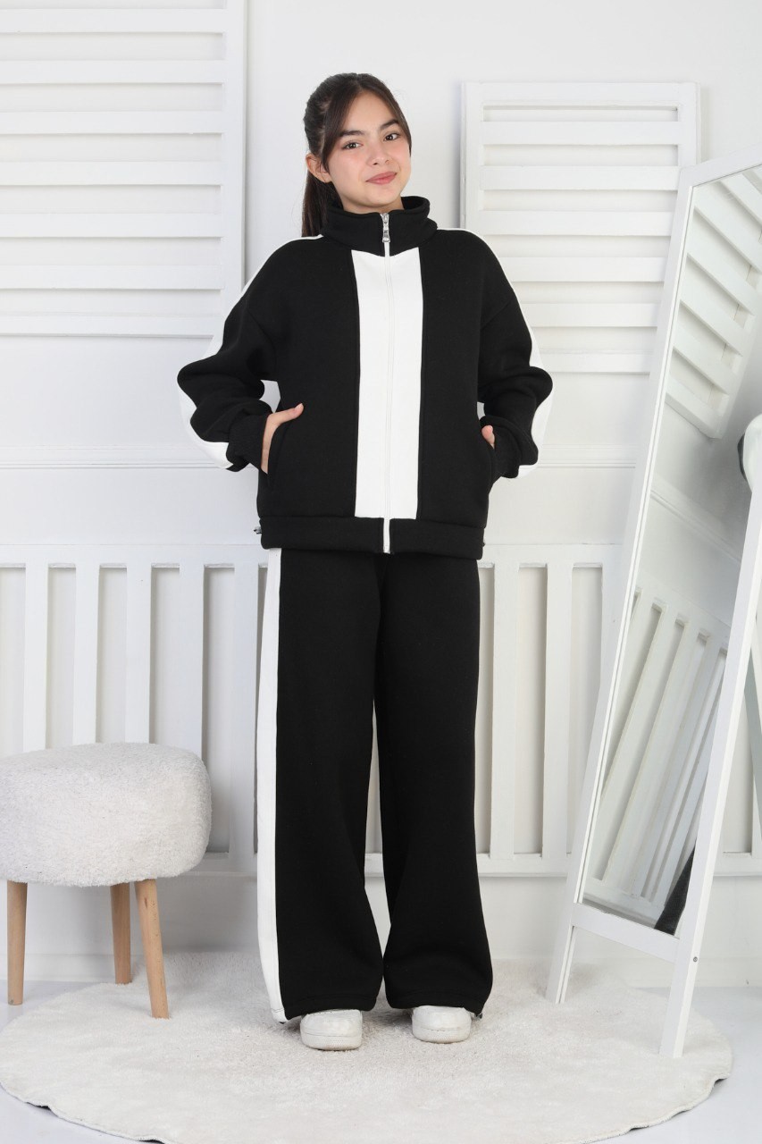Üç İplik Şardonlu Çizgili Fermuarlı Kız Çocuk Siyah İkili Takım