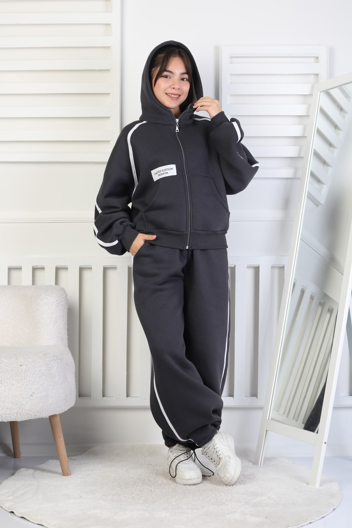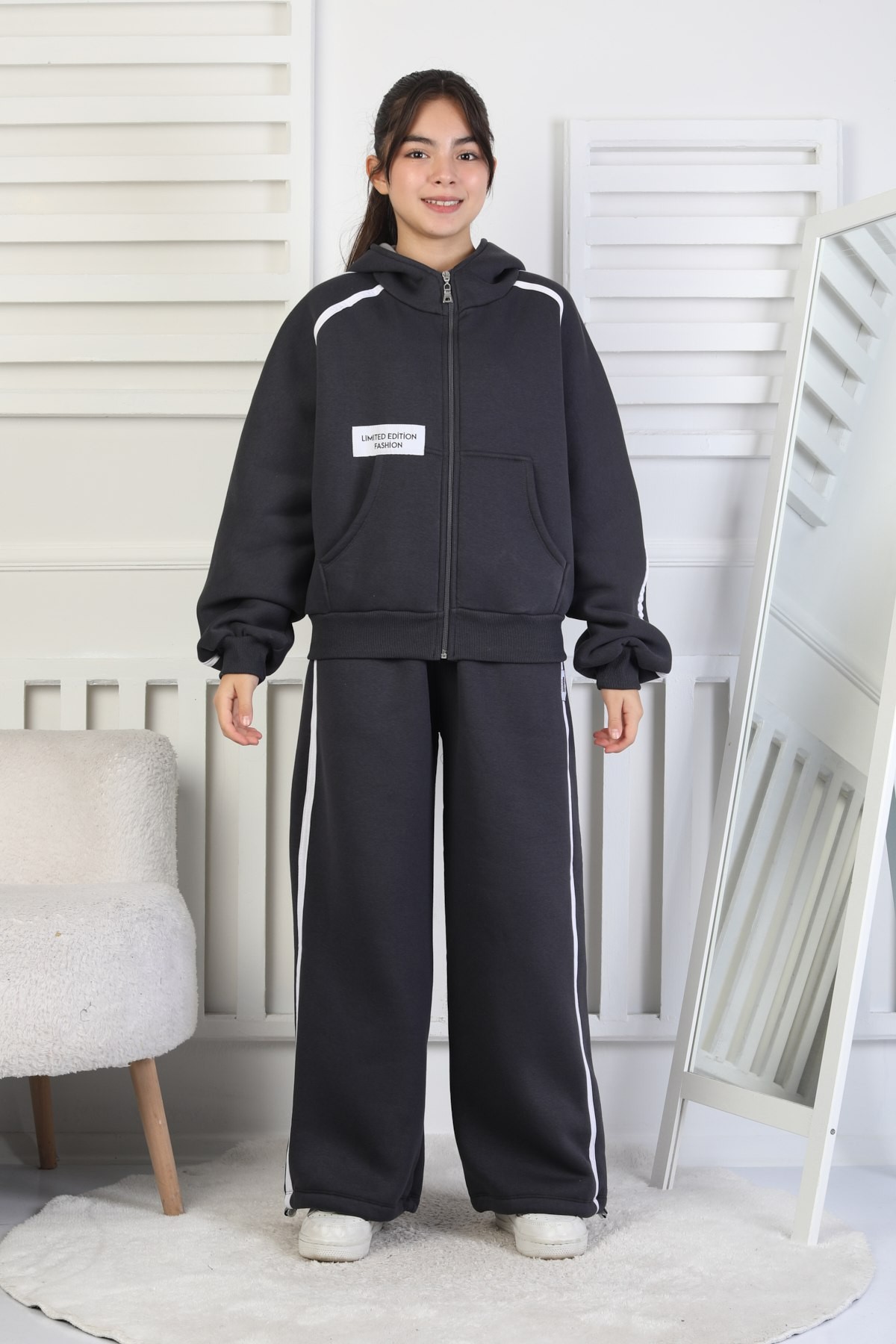 Üç İplik Şardonlu Fermuarlı Kapüşonlu Kız Çocuk Antrasit İkili Takım
