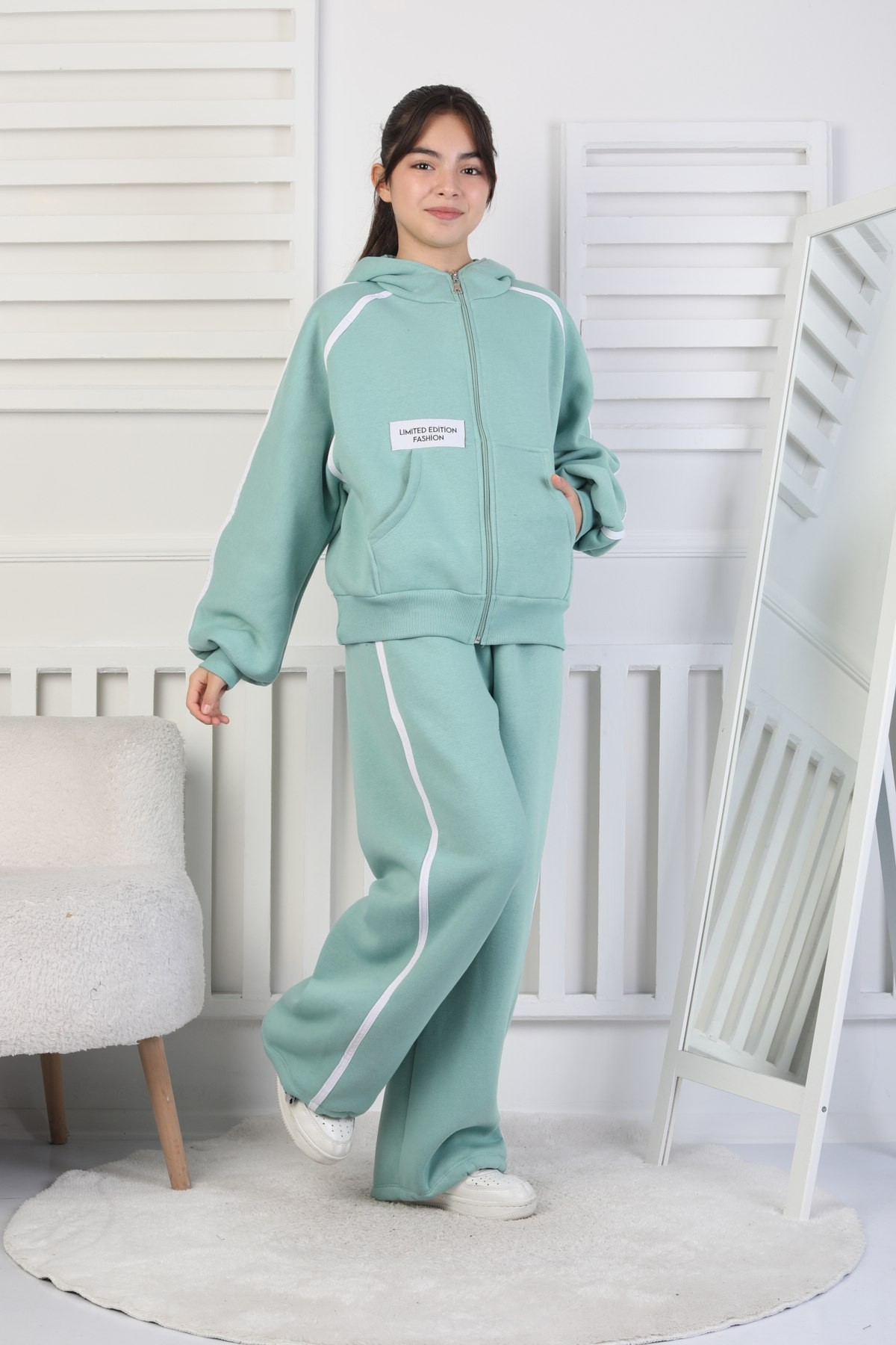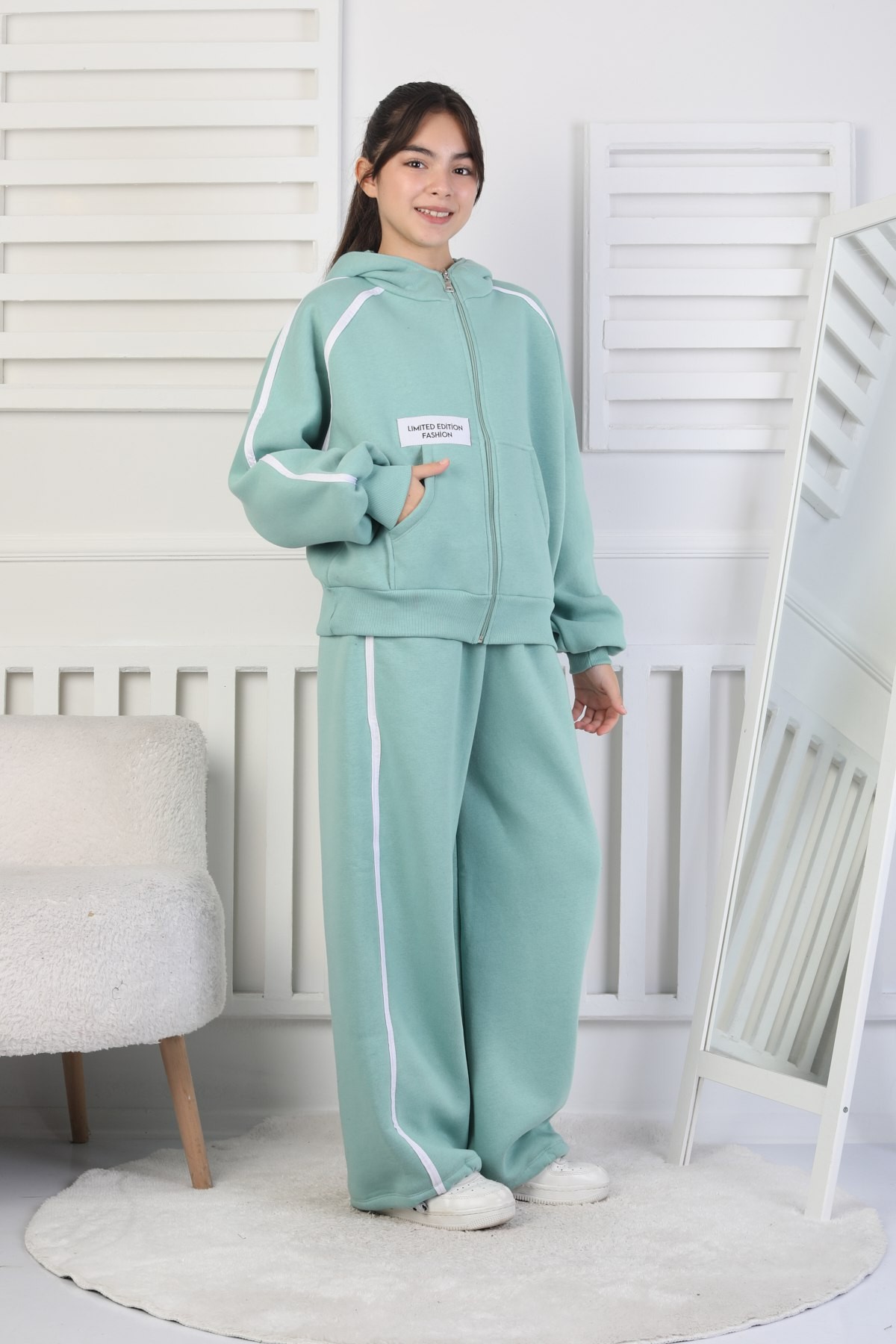Üç İplik Şardonlu Fermuarlı Kapüşonlu Kız Çocuk Yeşil İkili Takım