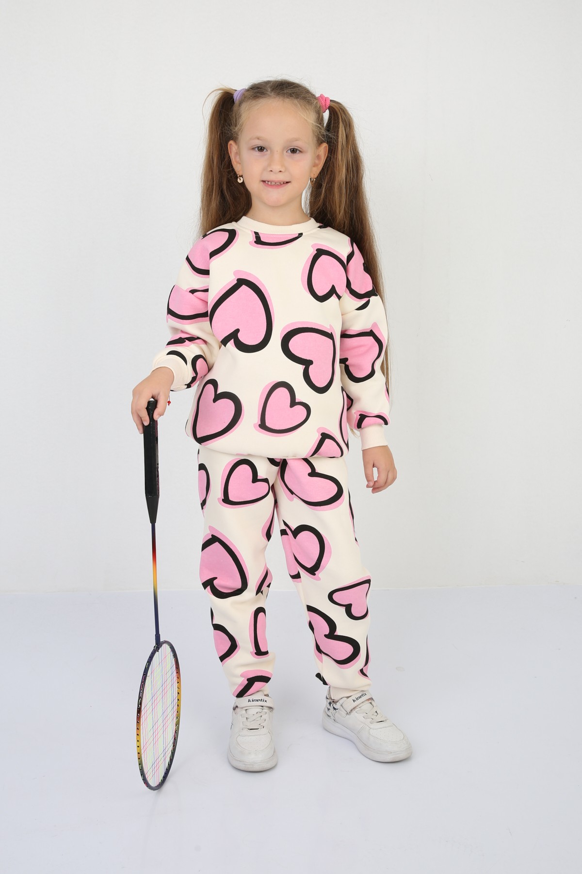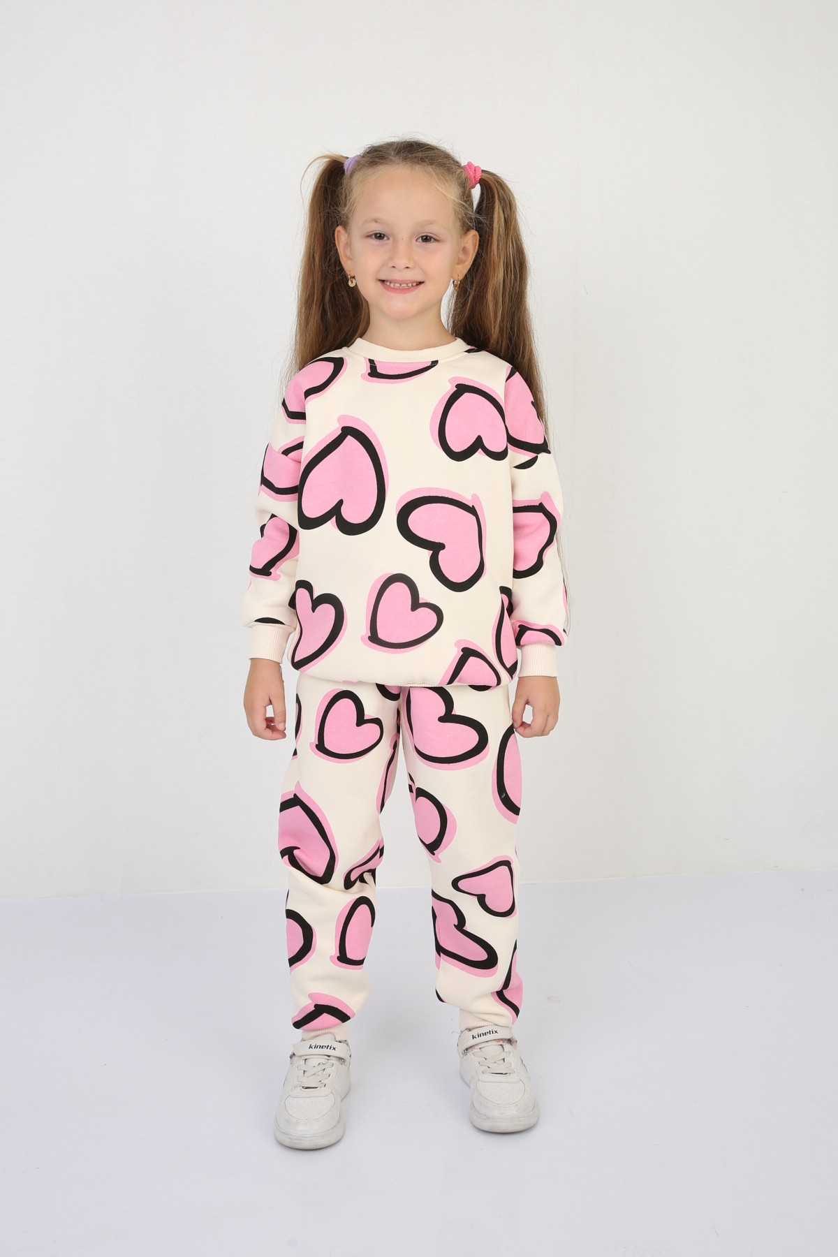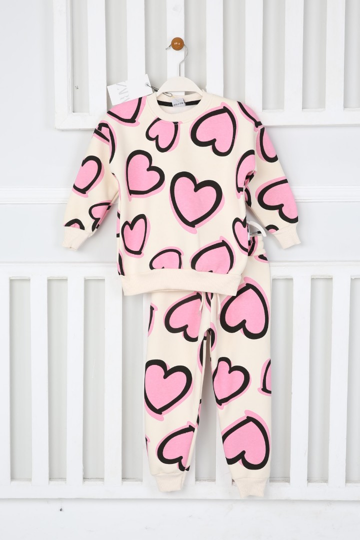 Üç İplik Şardonlu Kalp Baskılı Kız Çocuk Günlük Takım