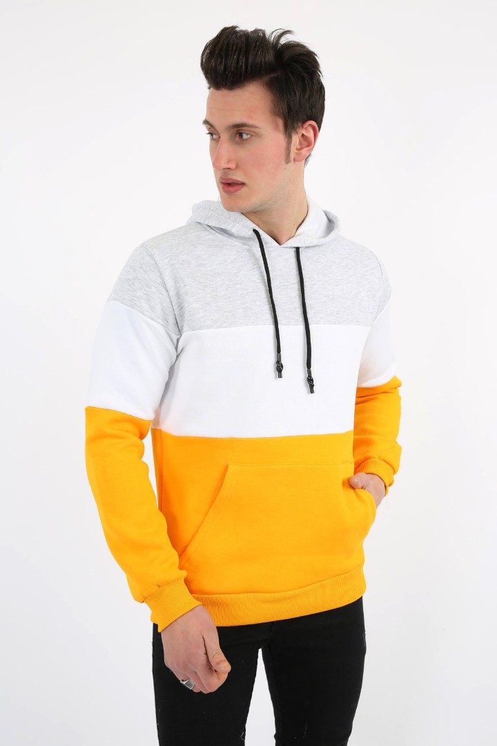 Üç İplik Şardonlu Kapşonlu Kanguru Cepli Parçalı Erkek Günlük Sweatshirt