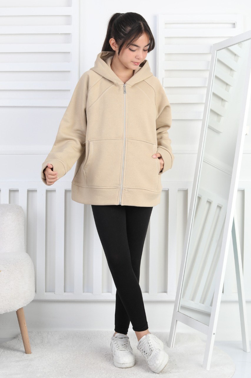 Üç İplik Şardonlu Kapşonlu Kız Çocuk Bej Sweatshirt