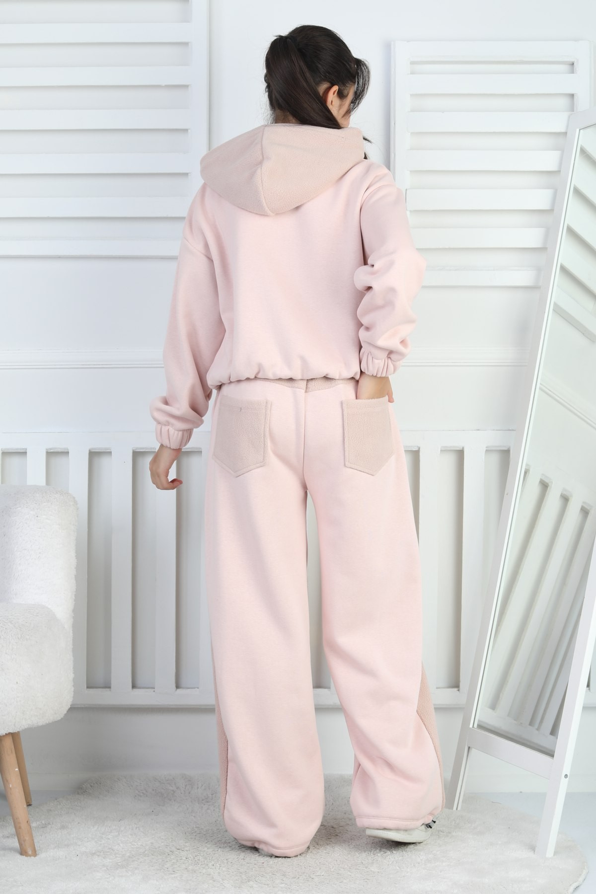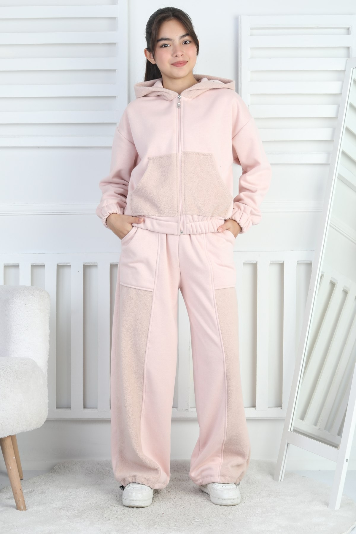 Üç İplik Şardonlu Kapüşonlu Kız Çocuk Pudra İkili Takım