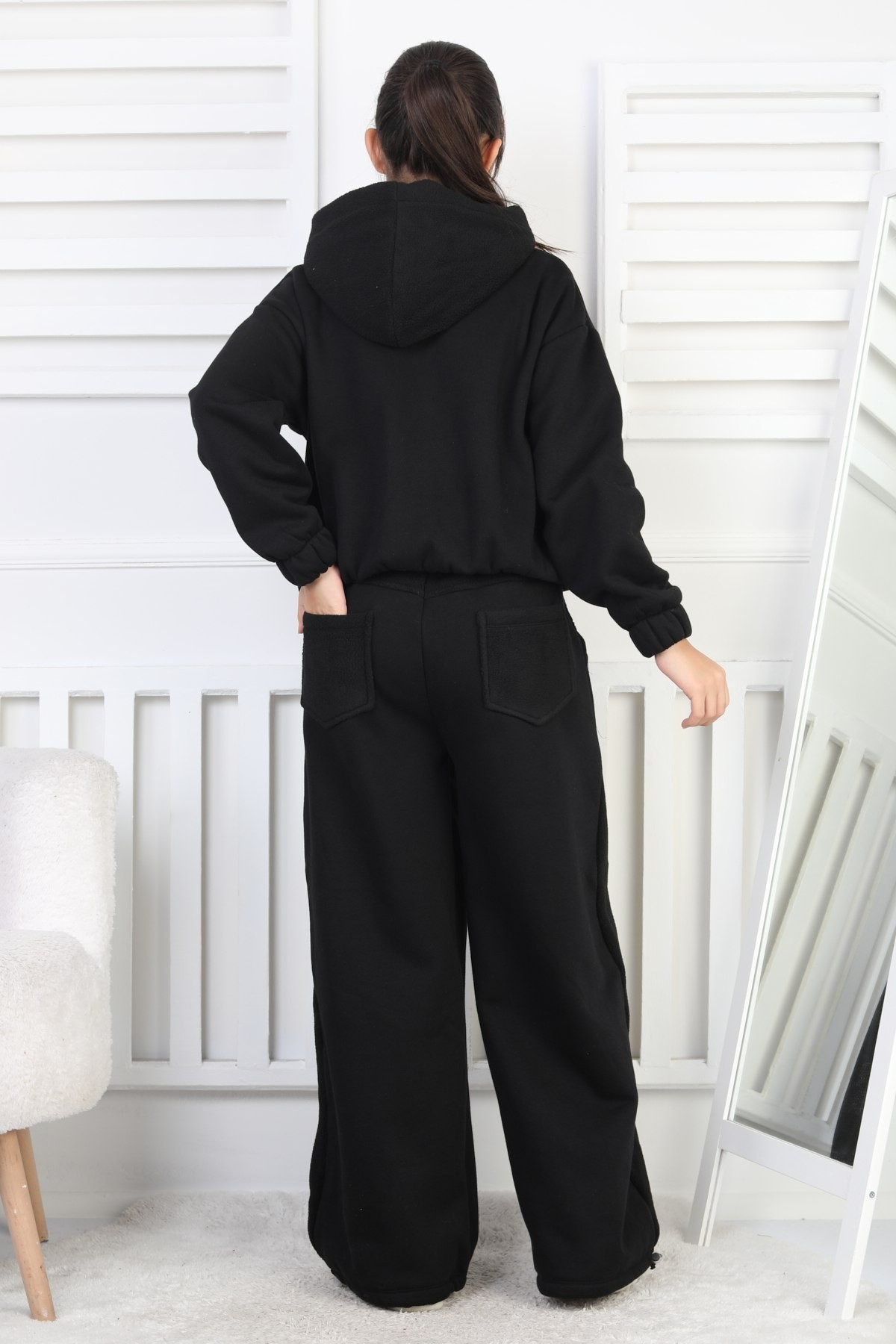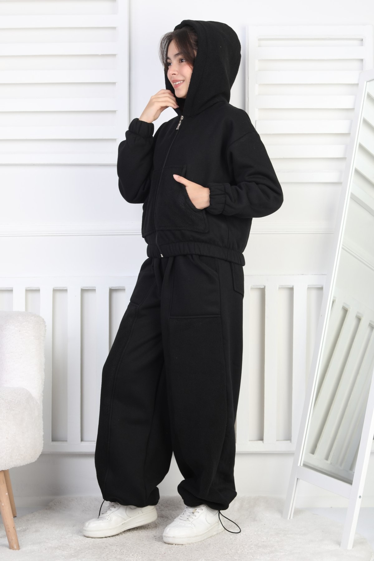 Üç İplik Şardonlu Kapüşonlu Kız Çocuk Siyah İkili Takım