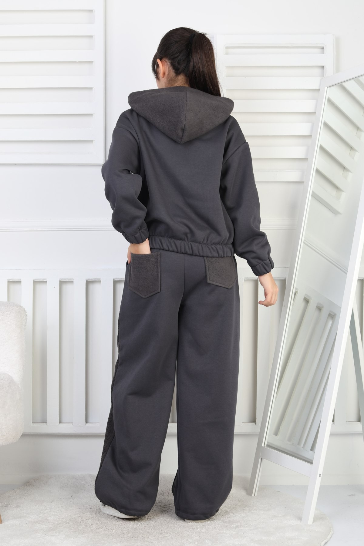 Üç İplik Şardonlu Kapüşonlu Kız Çocuk Antrasit İkili Takım