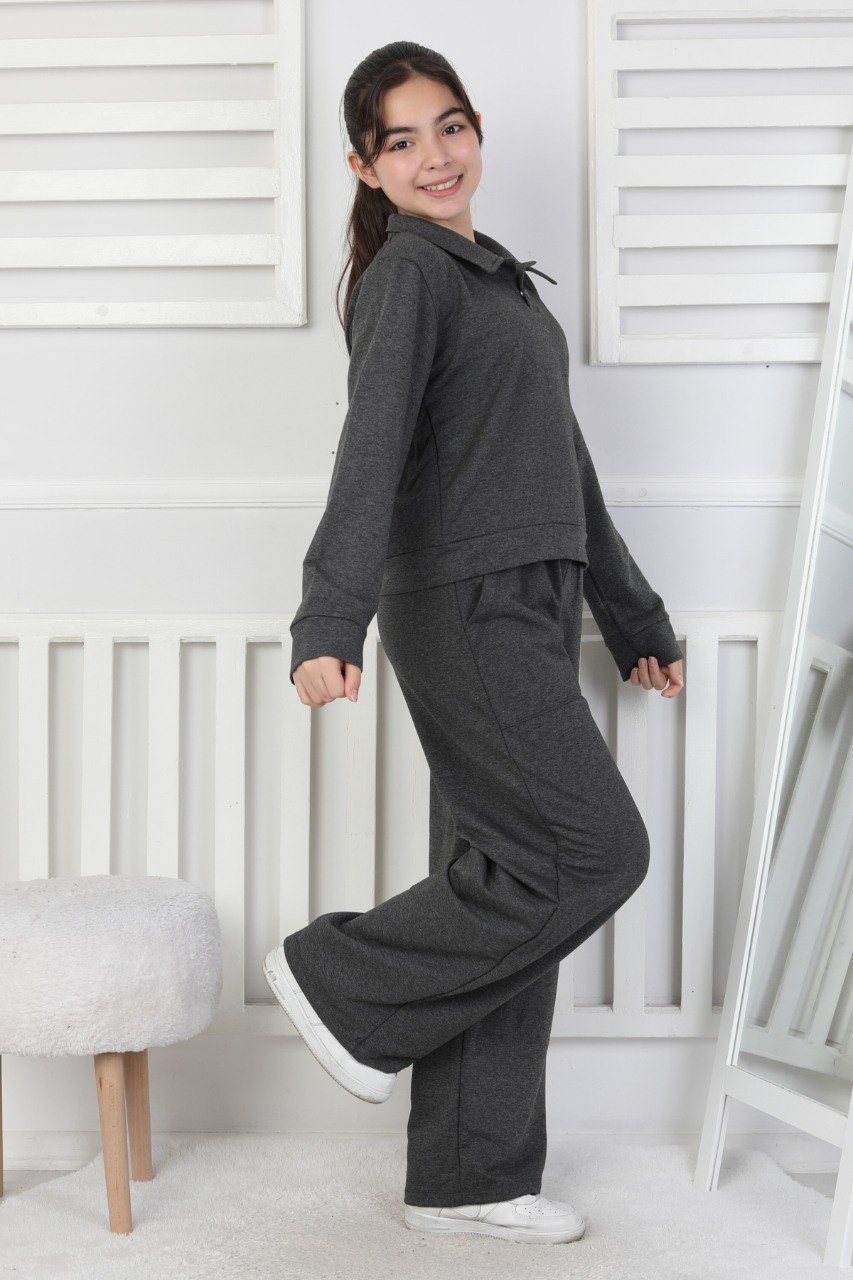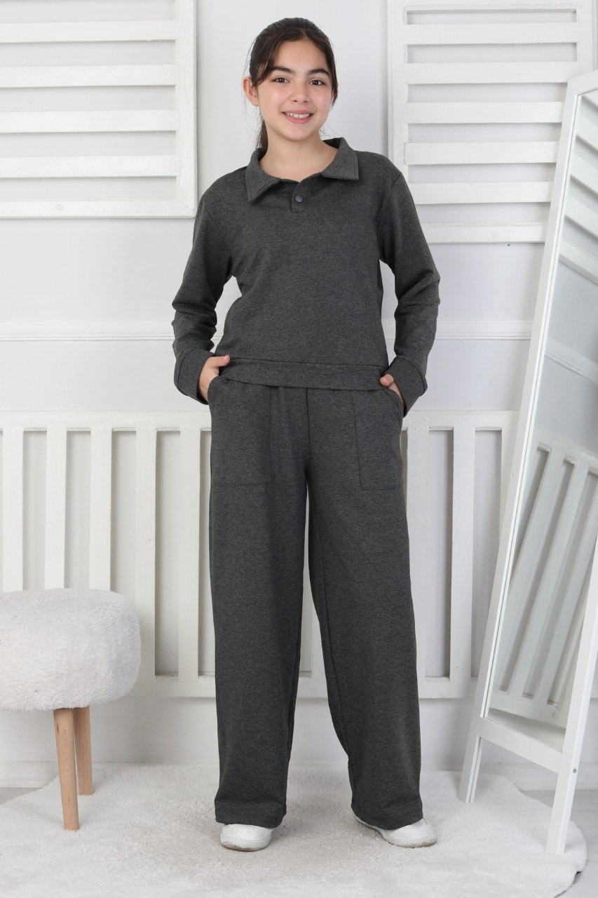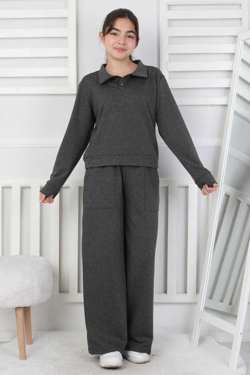 Yakalı Cepli Bol Paça Antrasit Kız Çocuk İkili Takım