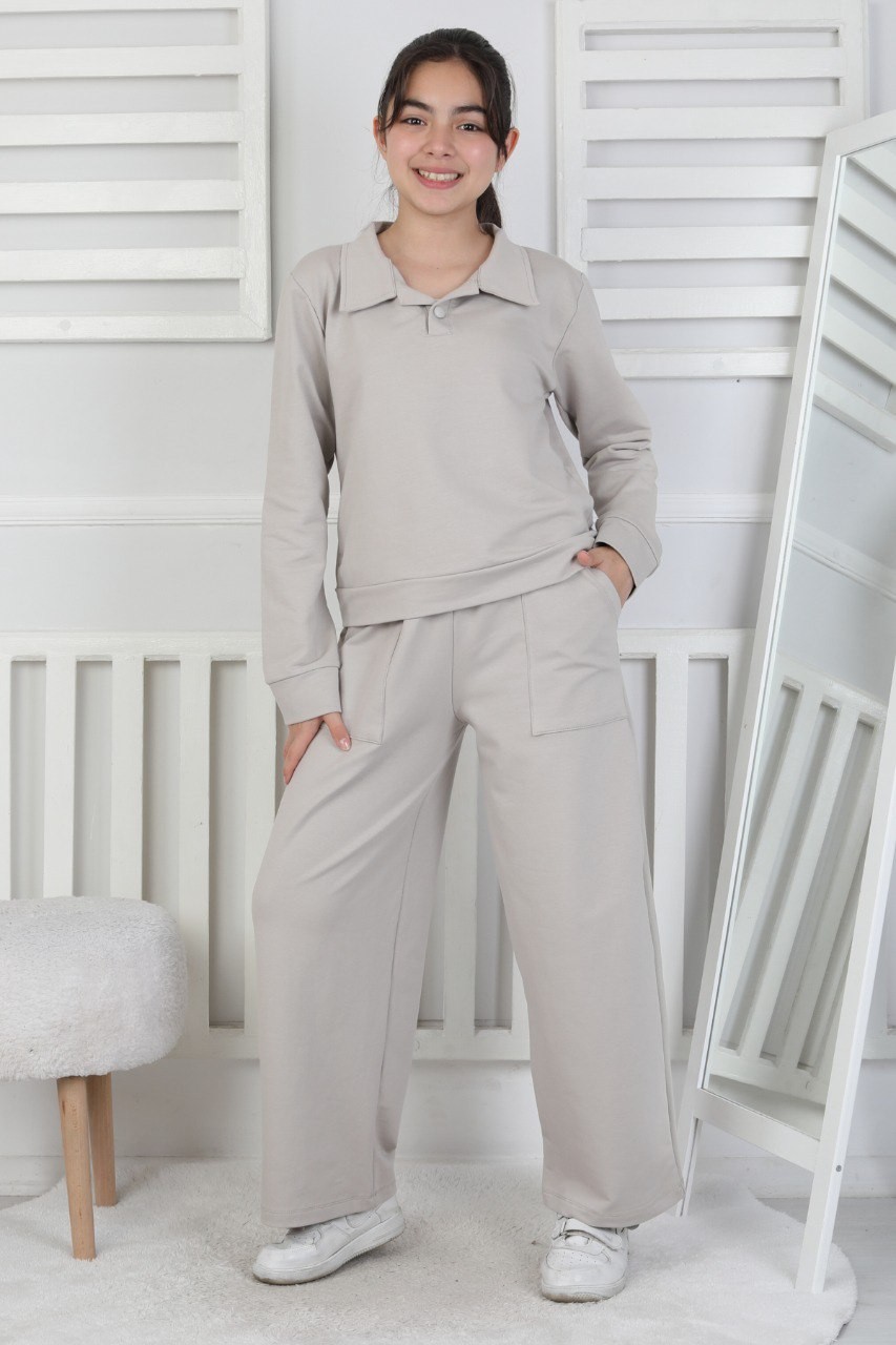 Yakalı Cepli Bol Paça Kız Çocuk Gri İkili Takım